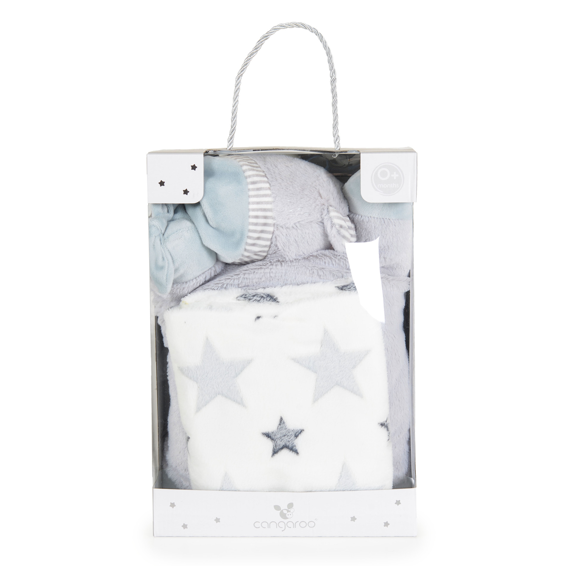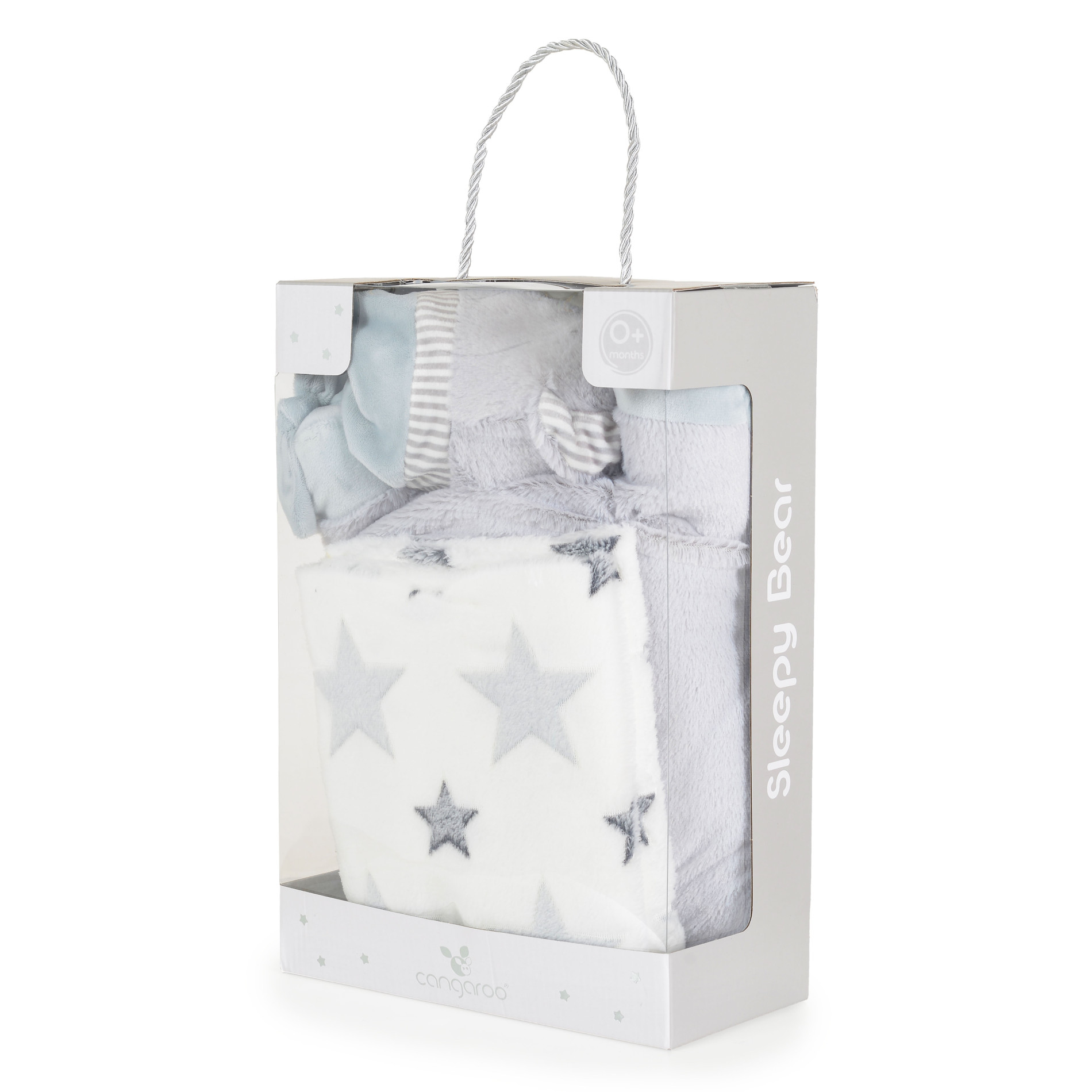 Прекрасен комплект, включващ мека възглавничка във формата на сладко мече с размери 40x38 см и уютно одеяло с размери 75x90 см;