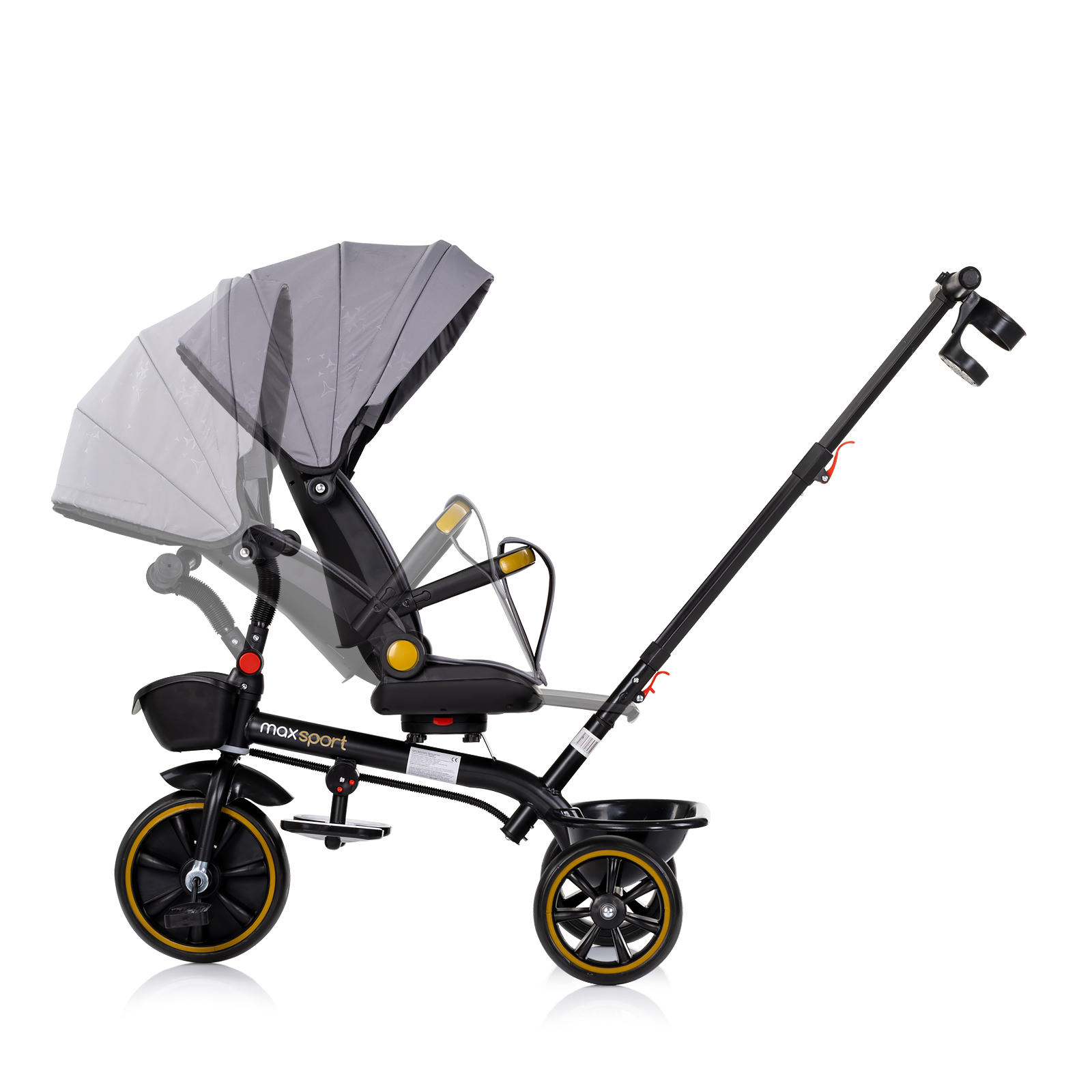 • Сенника, дръжката и предпазния борда се отстраняват и играчката се трансформира в триколка за по-голямо дете;