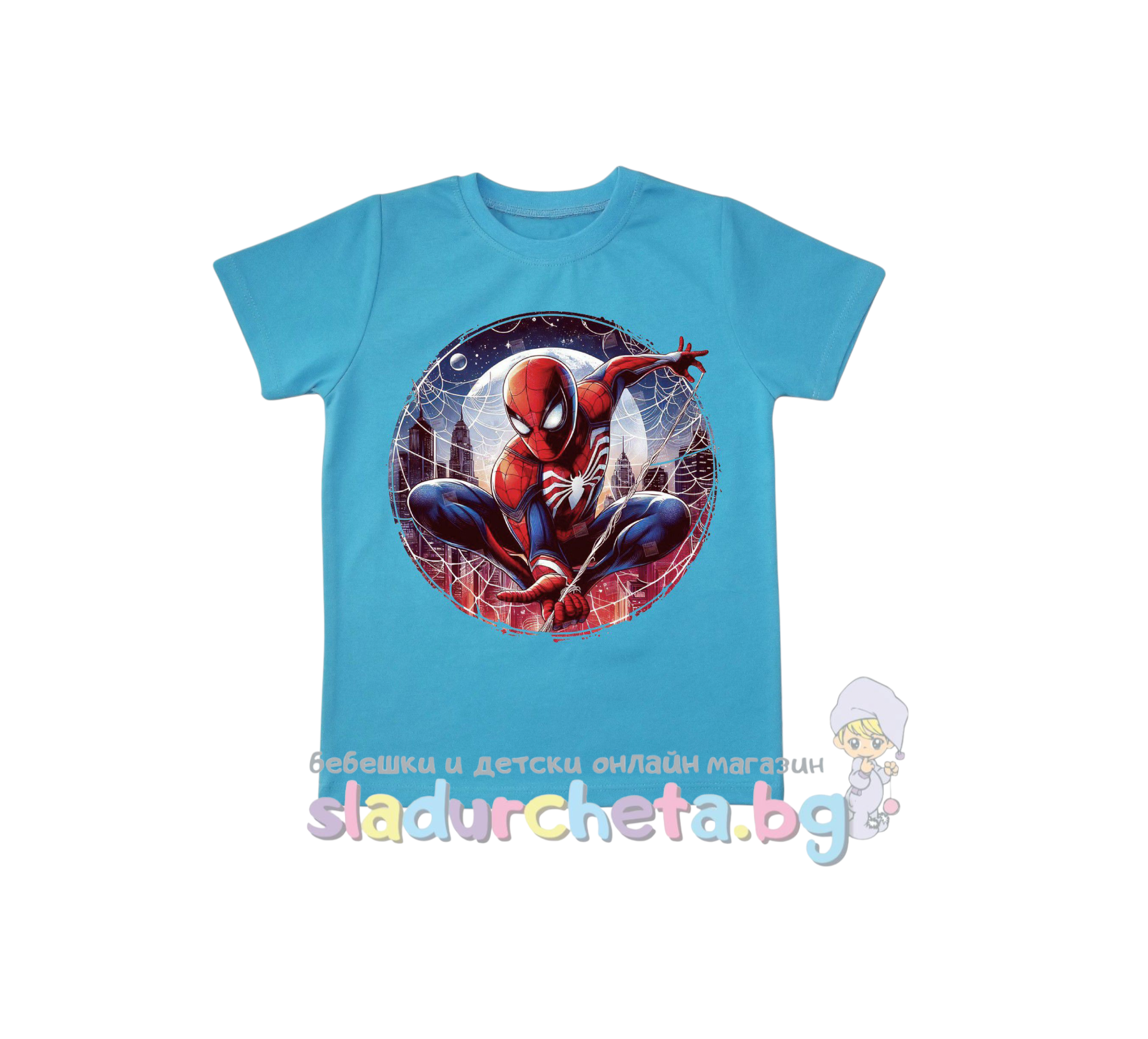 Тениската е с къси ръкави в син цвят с цветна апликация на Спайдърмен;