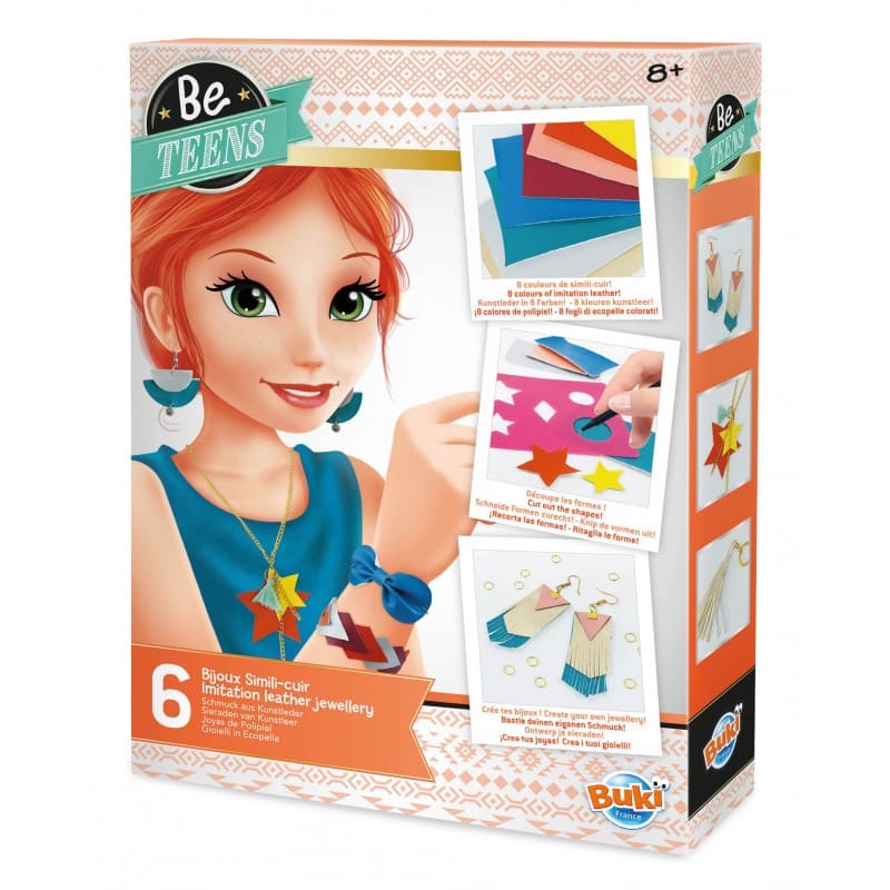 Създайте 6 цветни бижута от имитация на кожа, които ще изрежете и сглобите, за да ги превърнете в гривни, висулки или ключодържатели;