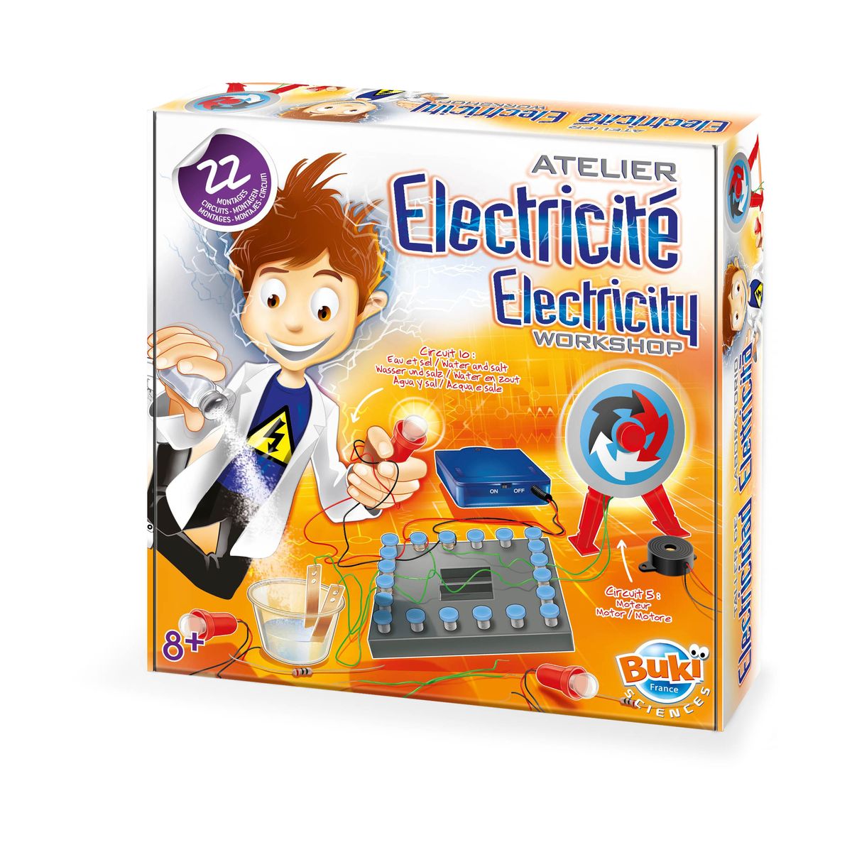 В комплекта има 22 лесни и безопасни вериги, без запояване, за да откриете електричество;
