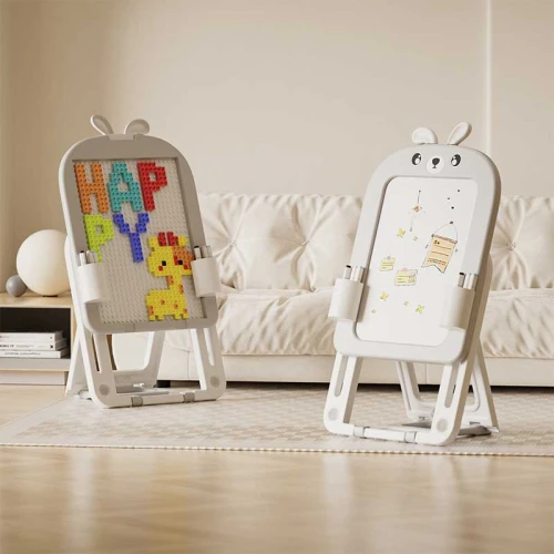 • Творческият комплект включва двойна дъска – едната страна е за игри с конструктор, а другата за рисуване, както и удобно столче с дизайн на зайче;