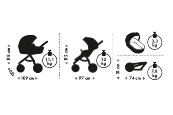 Размери разгъната с кош за новородено: 109 х 118 х 62 см / 11.1 кг;