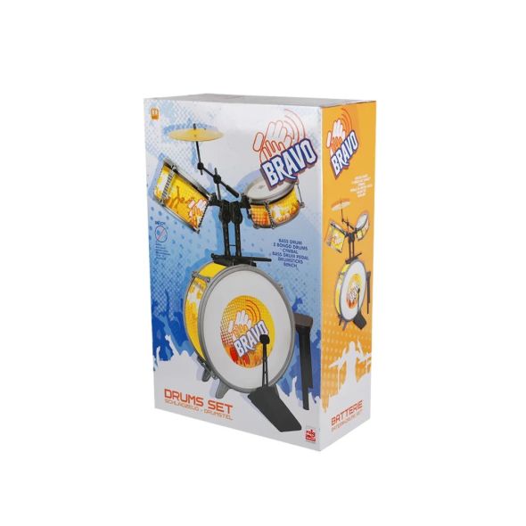 Този комплект детски барабани се предлага с 3 барабана и палки, а за да седнете удобно и да свирите като истински музикант, комплектът включва и табуретка;