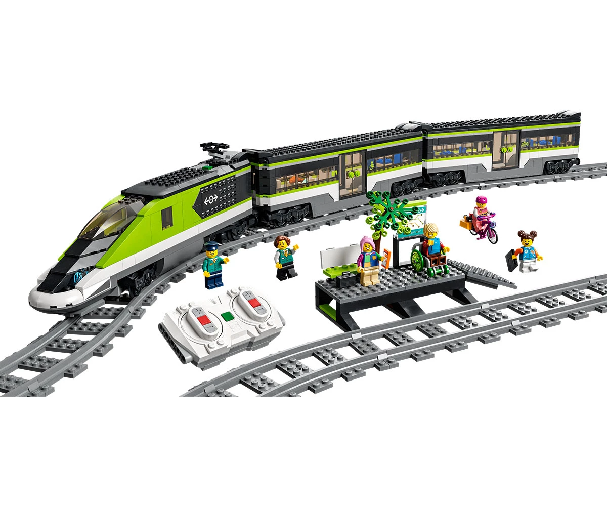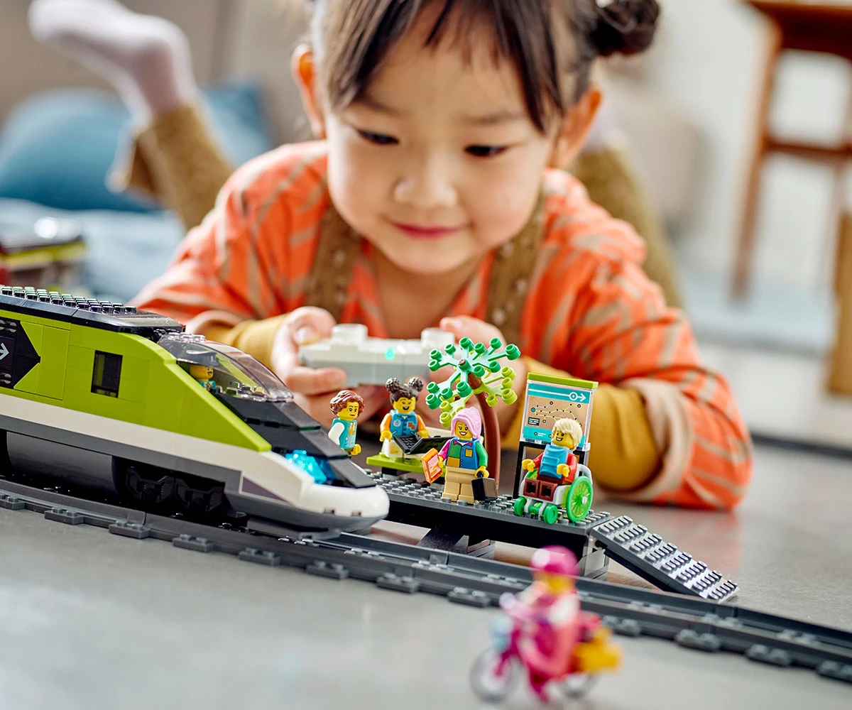 Включва аксесоари за минифигури на LEGO® – този комплект „Пътнически влак експрес“ се предлага с лаптоп, телефон, велосипед, инвалидна количка, куфарче, раница и хот-дог за минифигурите;