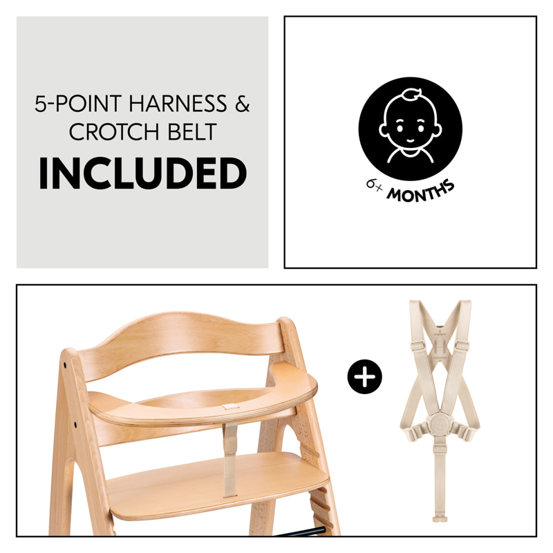 • Включена предпазна каишка, 5-точков колан и борд предпазват вашето дете, така че можете да се насладите на спокойно хранене;