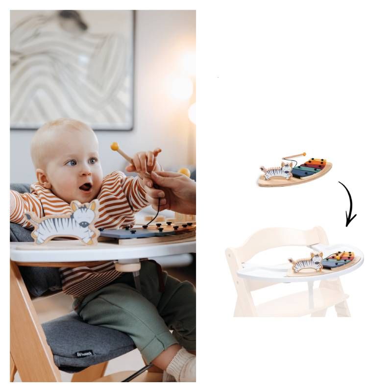 Върху таблата за хранене могат да се комбинират до две дървени играчки за столчета за хранене Hauck (всяка играчка се предлага отделно). ВАЖНО: Таблата за игра се предлага отделно и се различава от таблата за хранене;