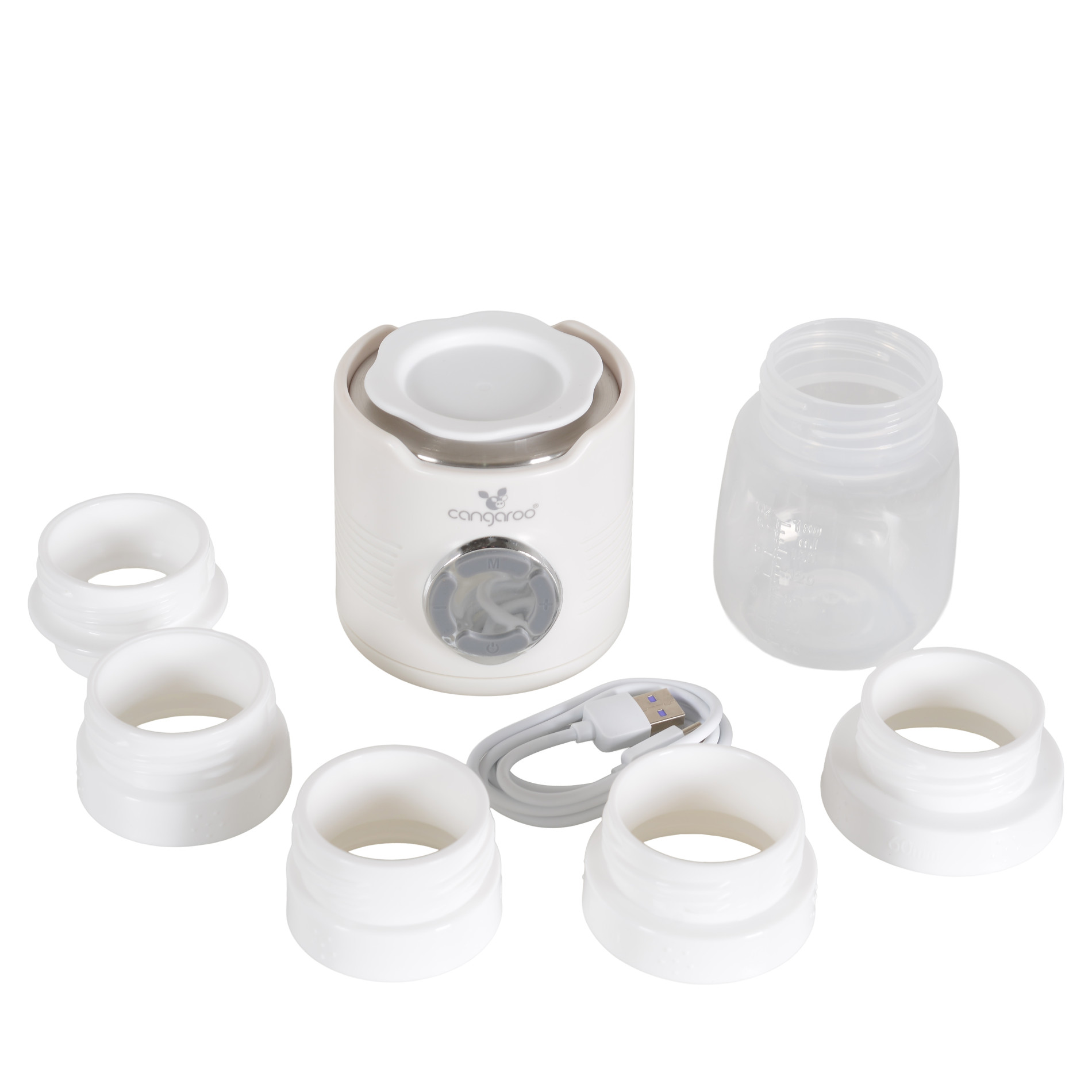 Аксесоари: включени 180ml шише, 5 адаптера за различни бебешки шишета, 1 капаче, USB кабел тип C за зареждане;
