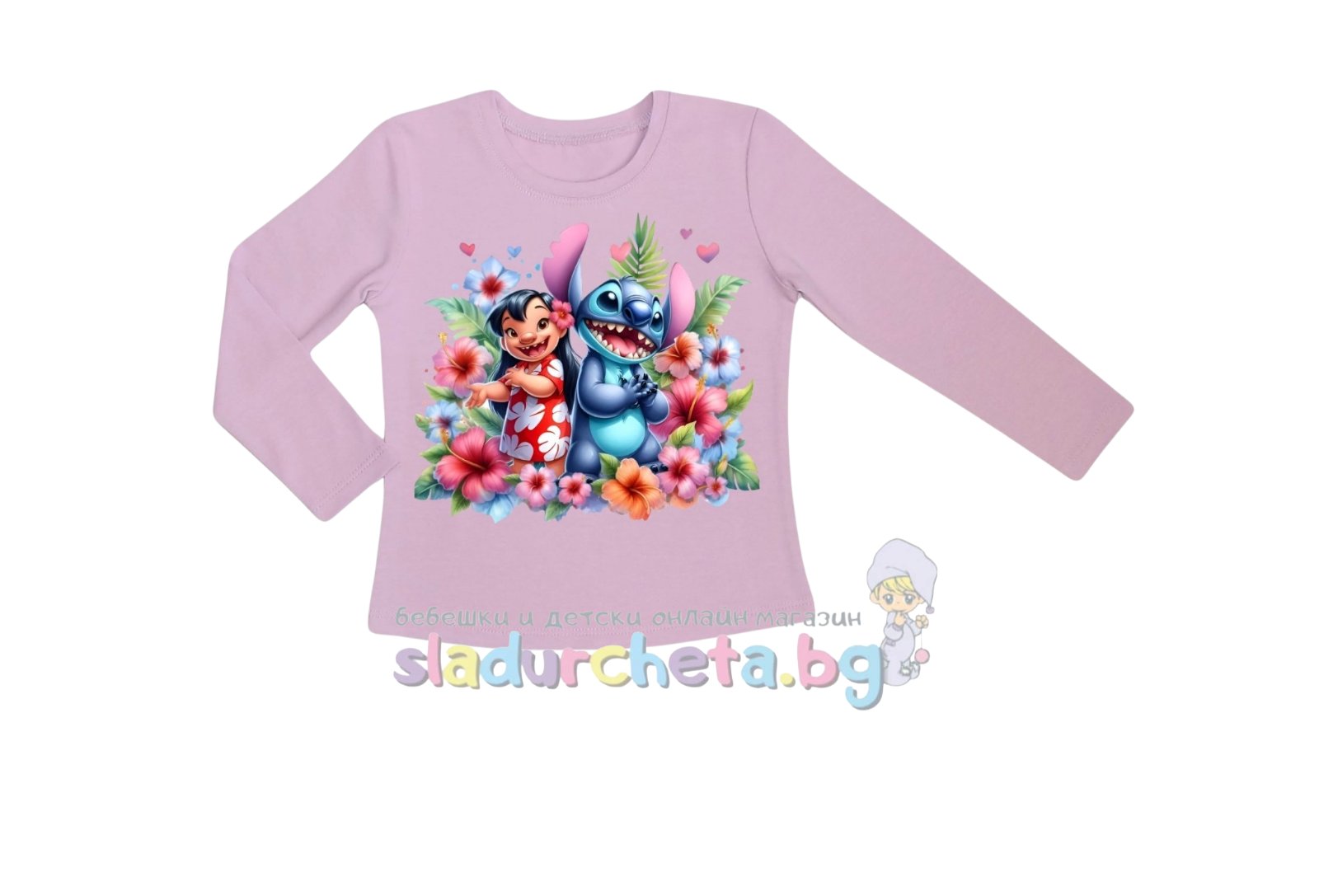 Блузата е с дълъг ръкав в лилава цвят с цветна картинка;