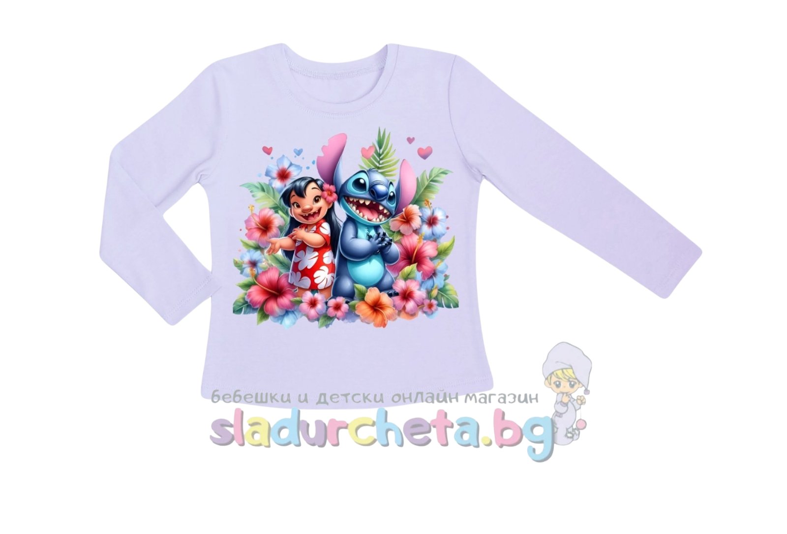 Блузата е с дълъг ръкав в светлолилава цвят с цветна картинка;