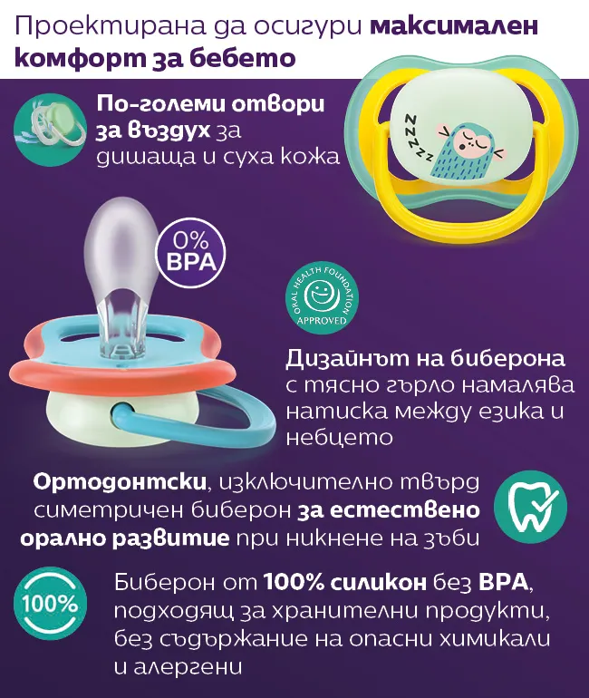 Симетричен и мек силиконов биберон подпомага естествените движения на устните мускули и здравословното развитие на устната кухина на бебето;