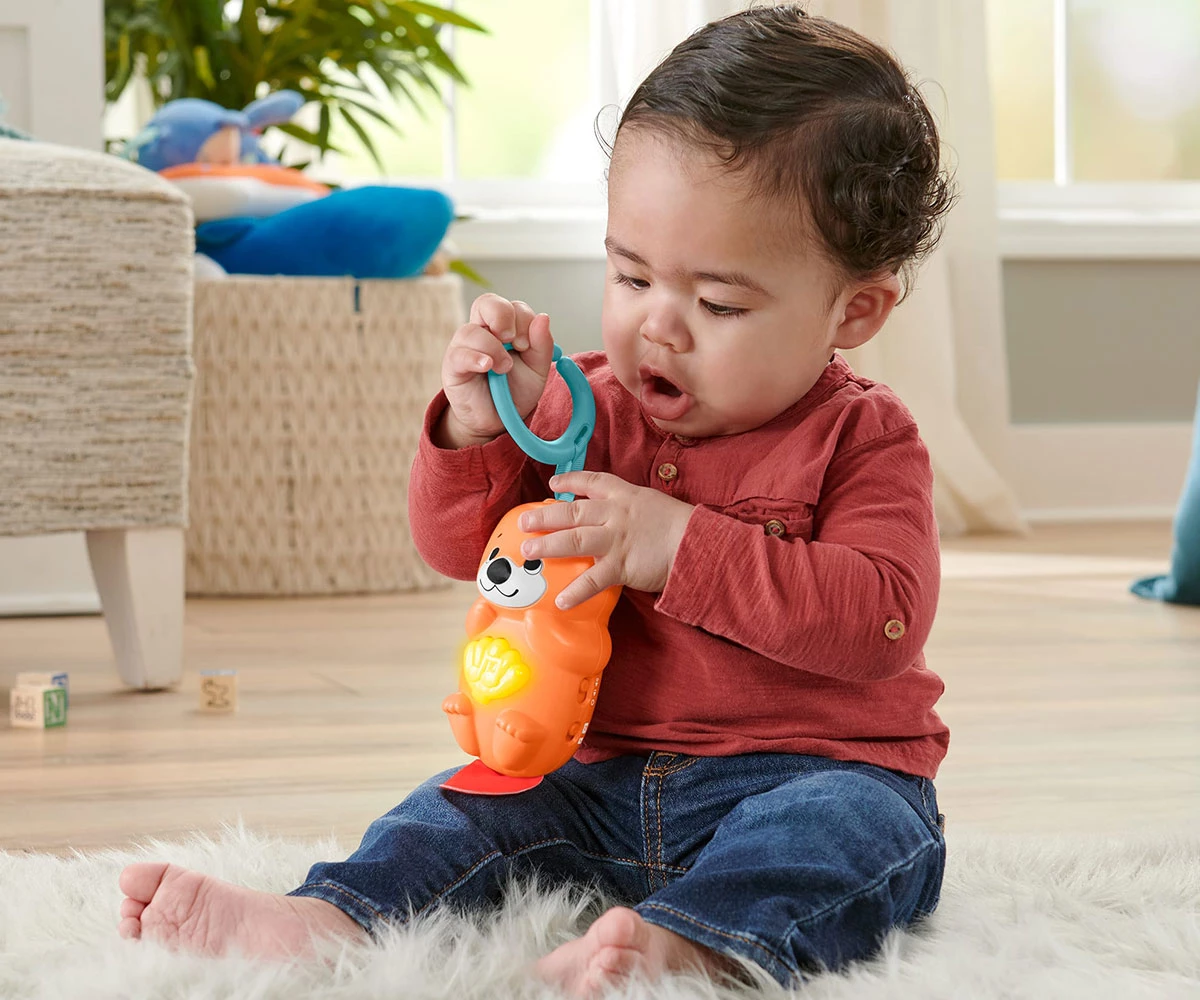 Включва 5 сензорни играчки: видра със светлини и музика, огледалце, дрънкалка таралежче, гризалка охлювче без BPA и двустранна шумоляща дъга;
