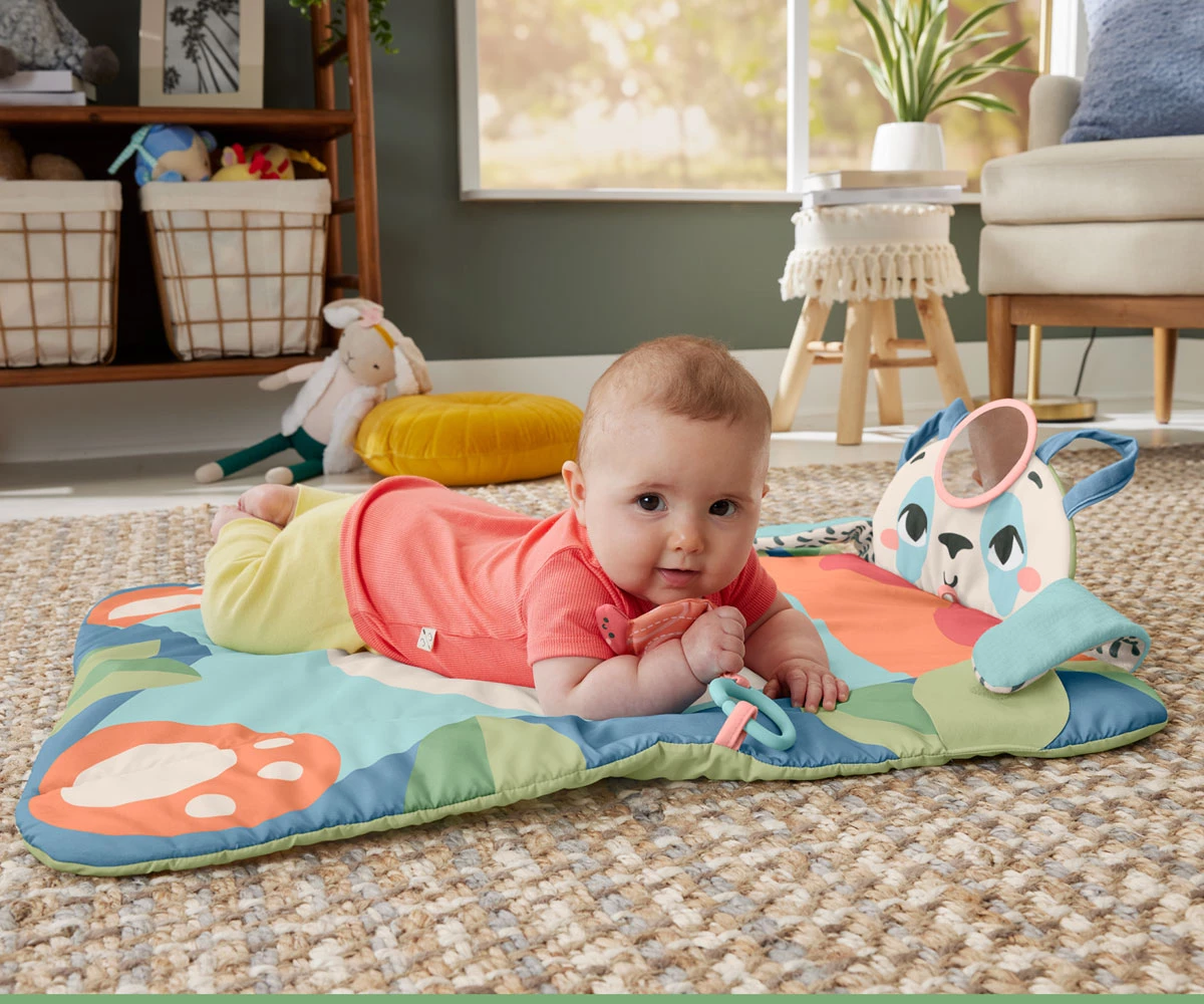 Шумолящата играчка и огледалото за самооткриване се свързват с панела за времето за игра по корем или се прикрепят към малките дръжки отстрани, за да поддържате времето за игра свежо и забавно;