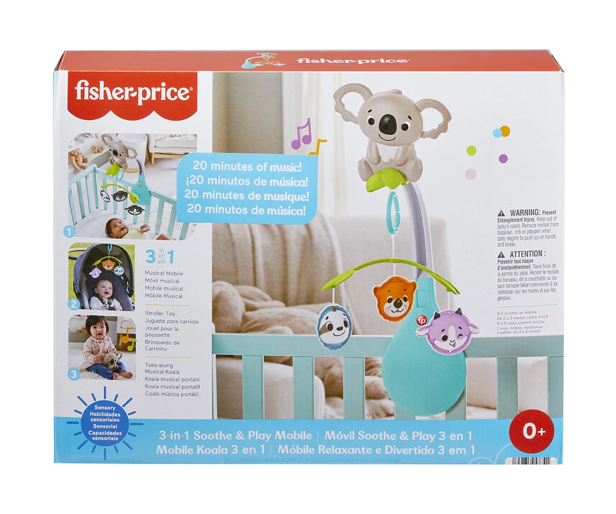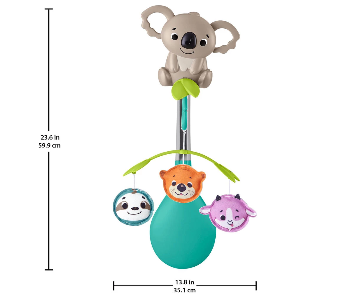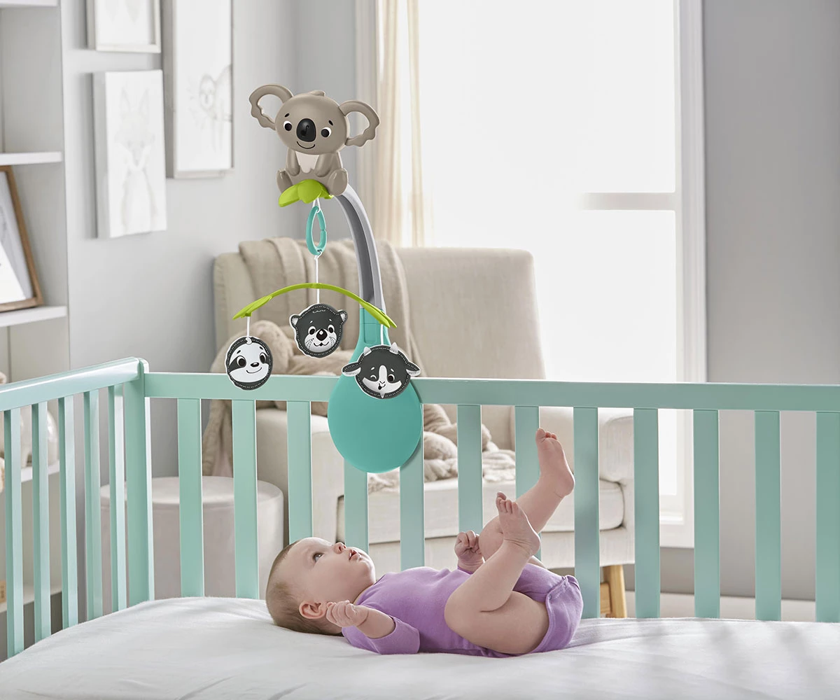 Мобилното устройство включва сладка коала и още 3 висящи играчки: цветни и с висок контраст, за да подпомогнат най-ранното сетивно развитие на вашето бебе;