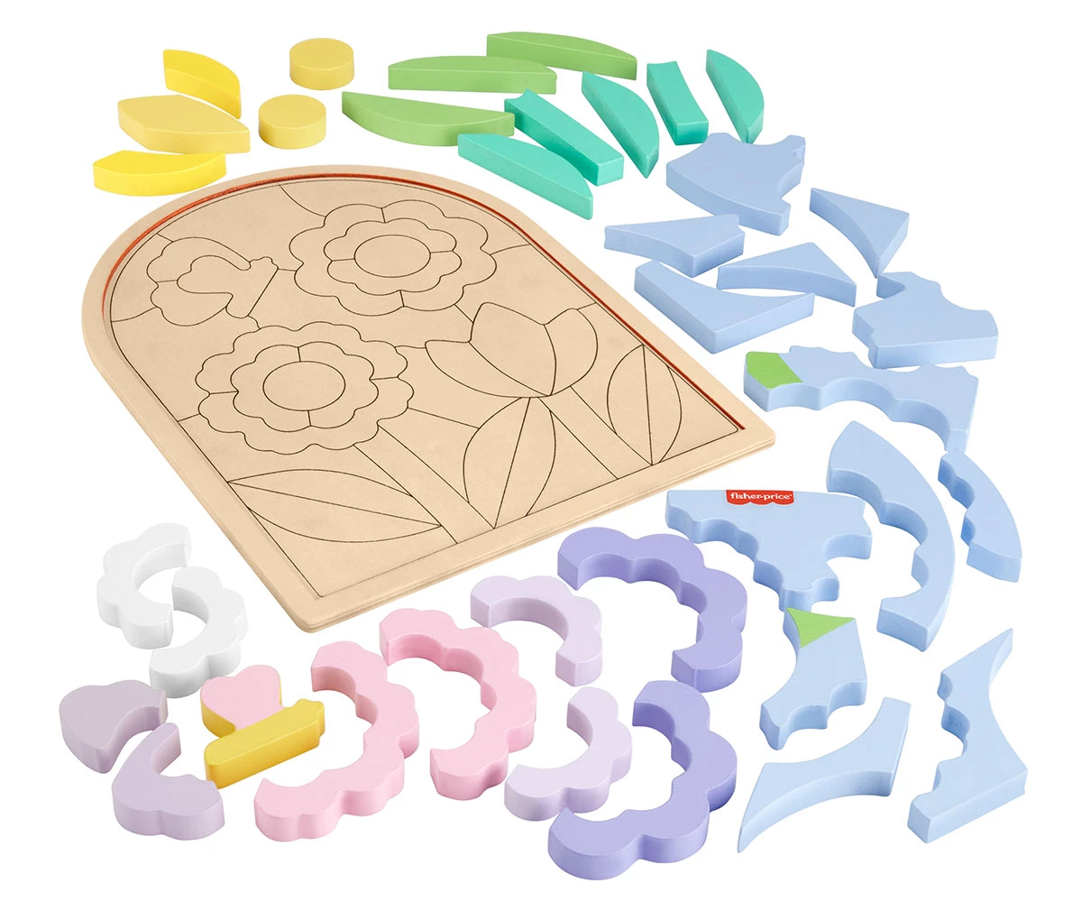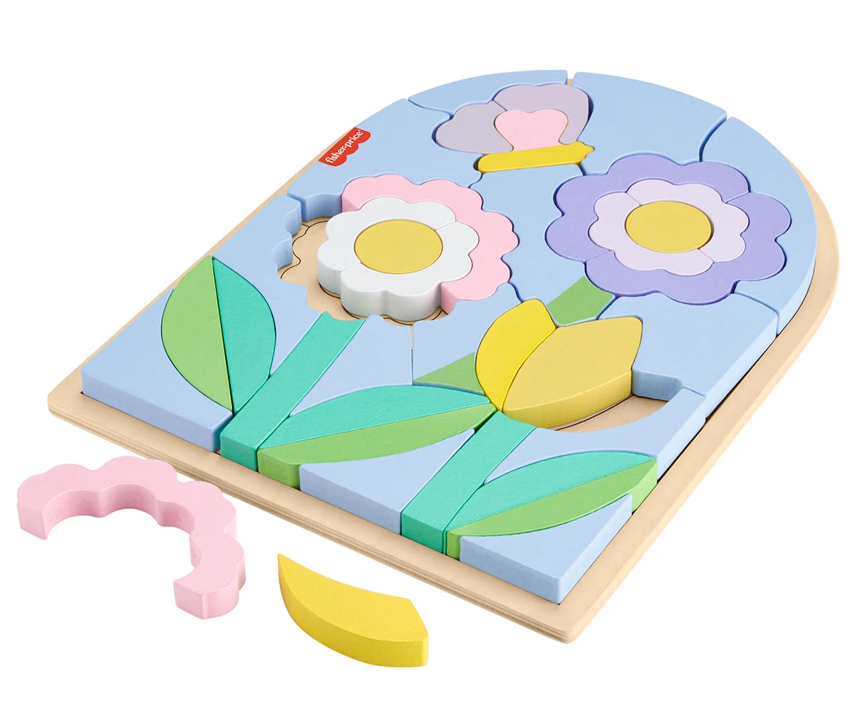 Този дървен пъзел с цветя от Fisher-Price позволява на децата да подреждат, сортират и създават забавни дизайни на цветя;