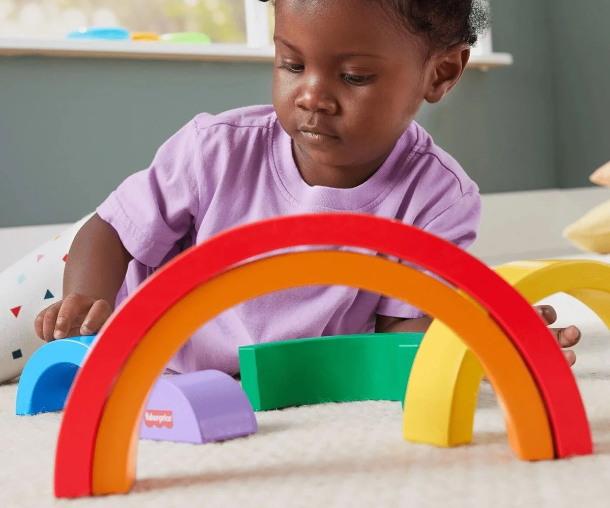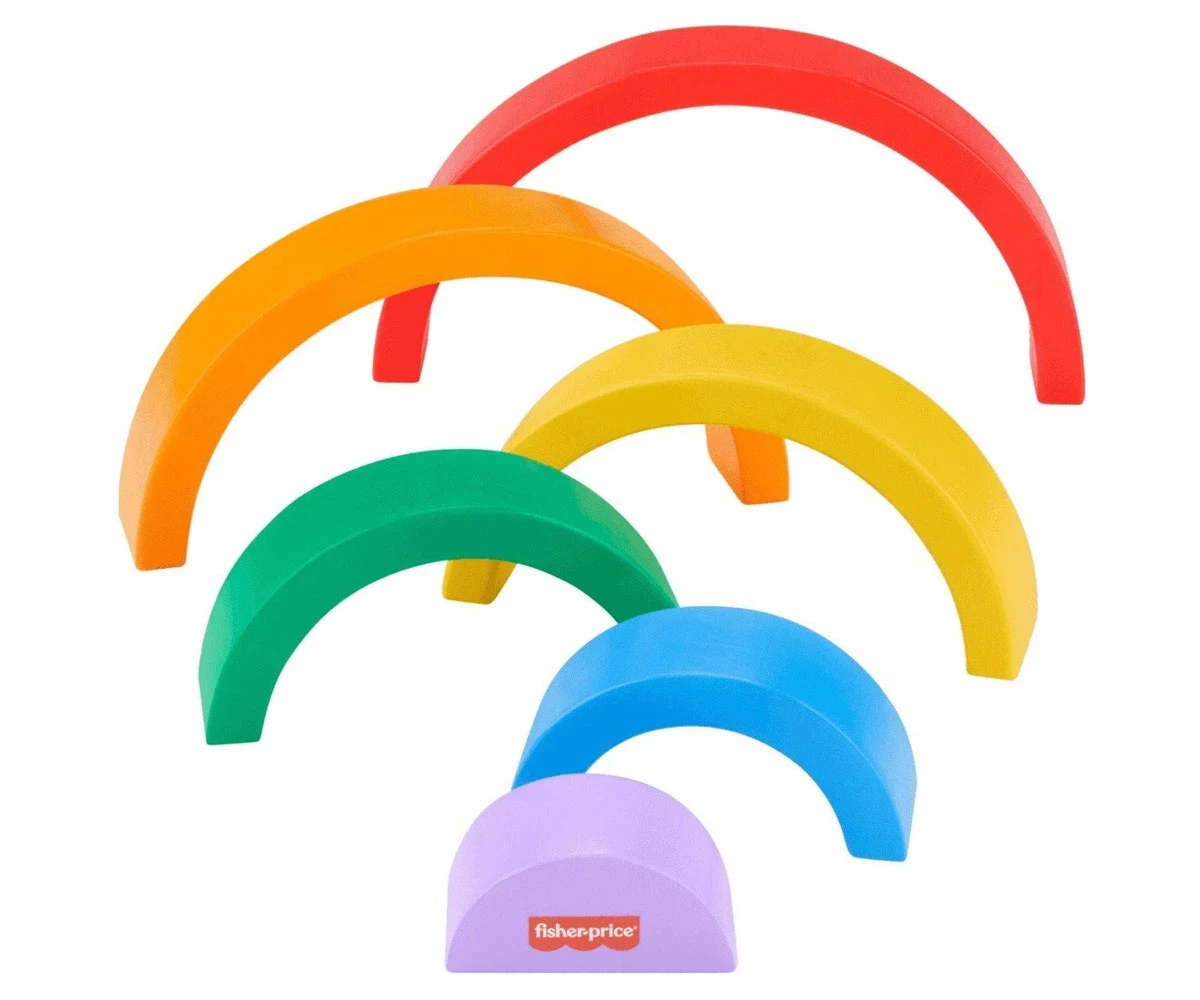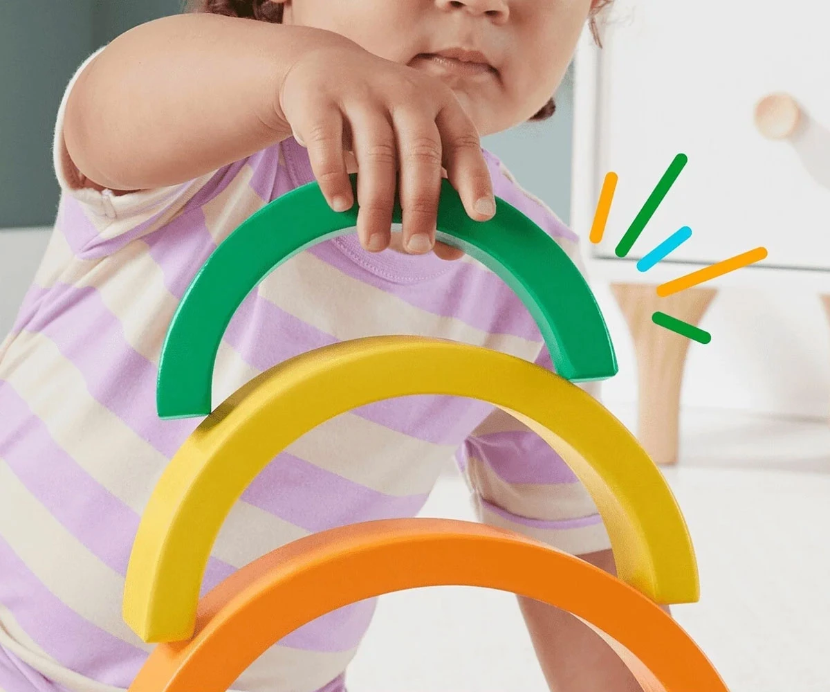 Дървената играчка за подреждане помага за запознаване с цветовете, размерите и как нещата се съчетават;
