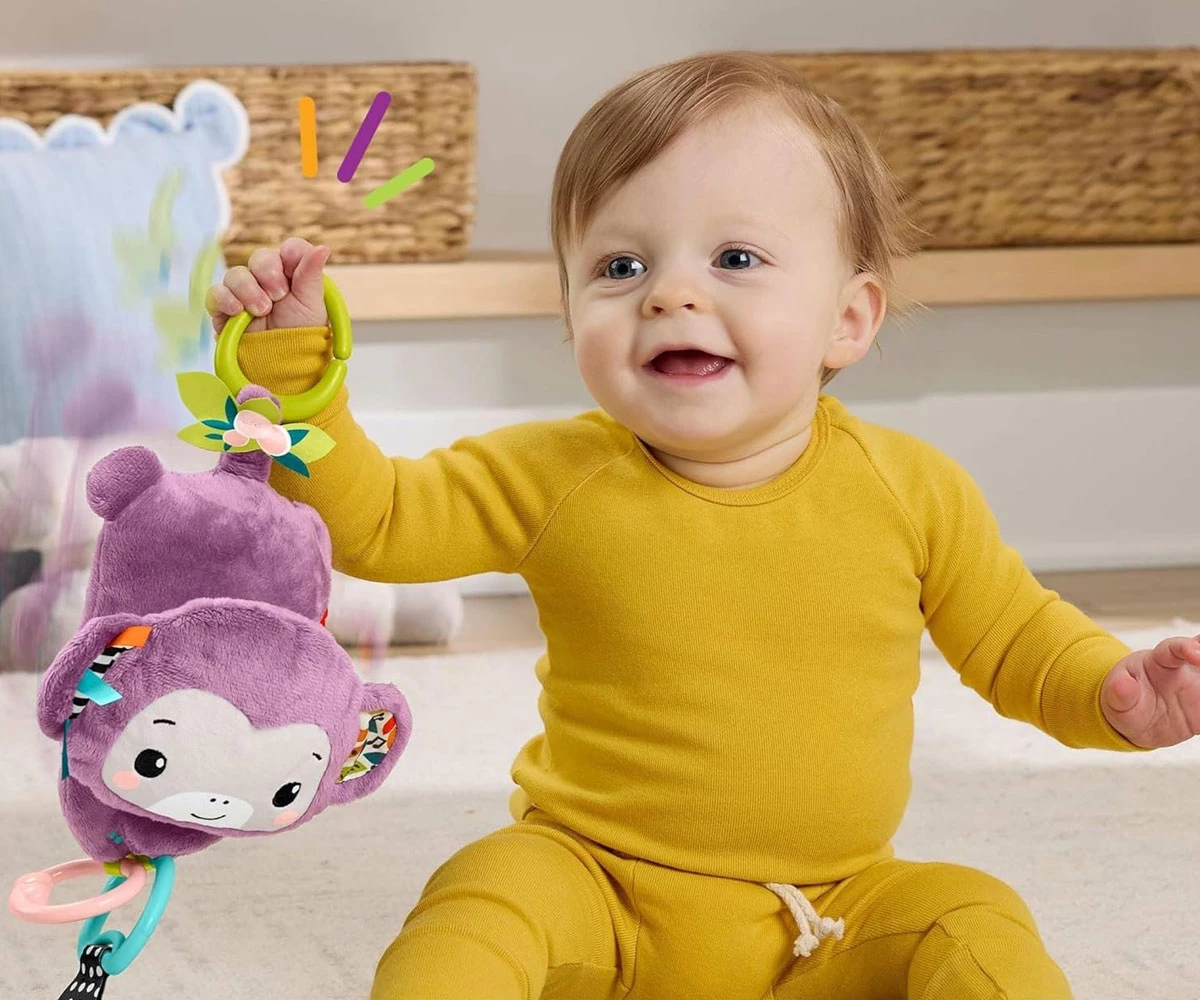 Лесно прикрепете маймунката към сенника на количката, бебешката гимнастика или чантата за пелени за игра по време на пътуване;