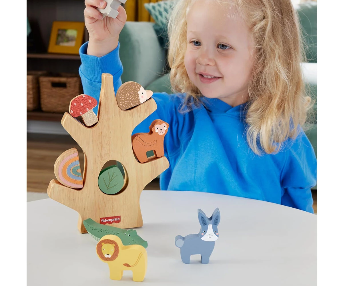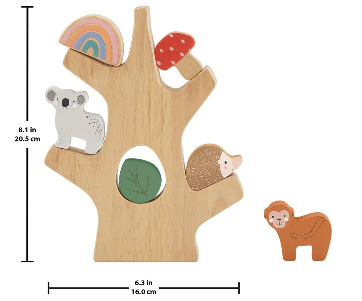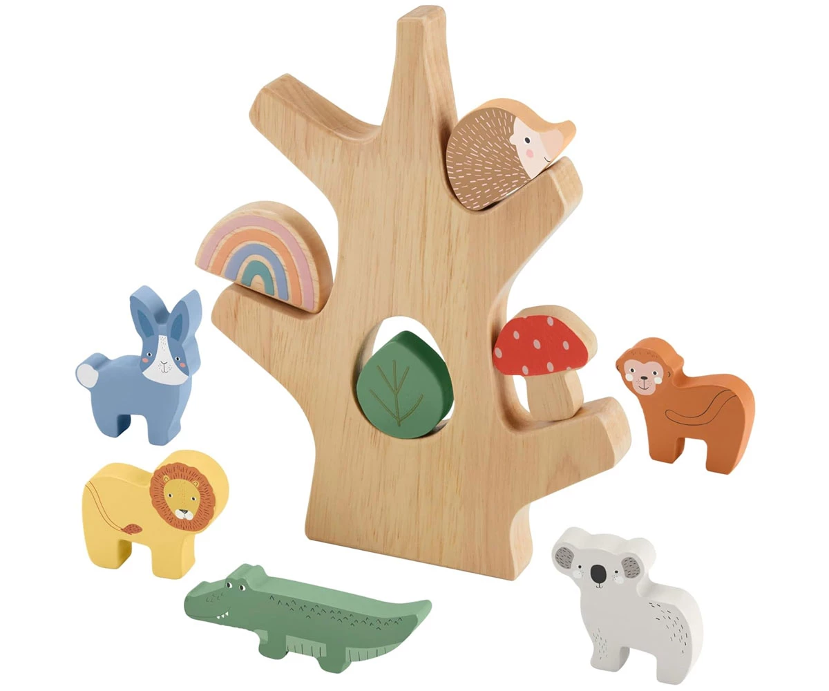 Този дървен комплект за игра включва 9 забавни блока, които децата могат да подреждат един върху друг или да балансират на клоните на дървото;