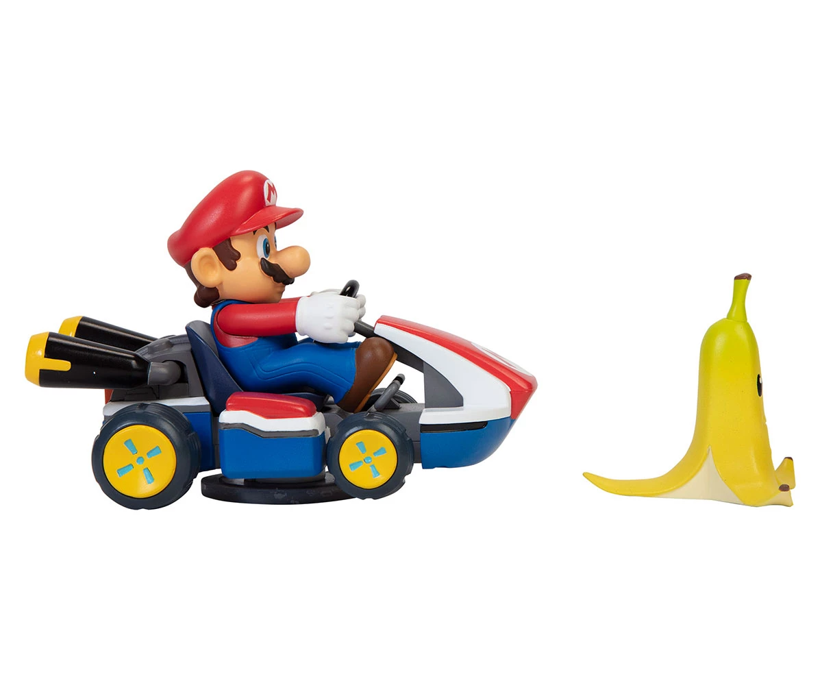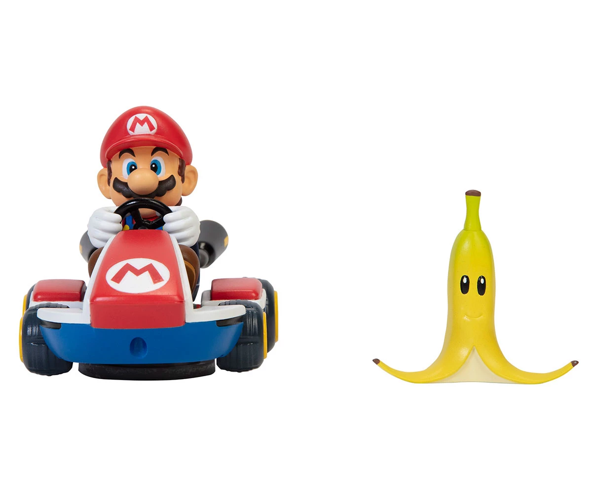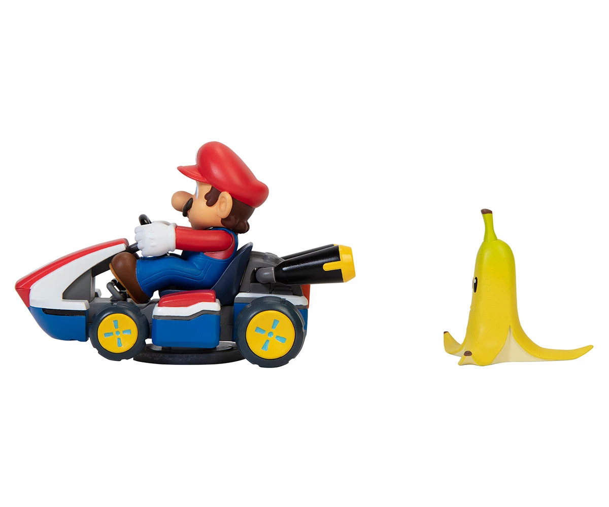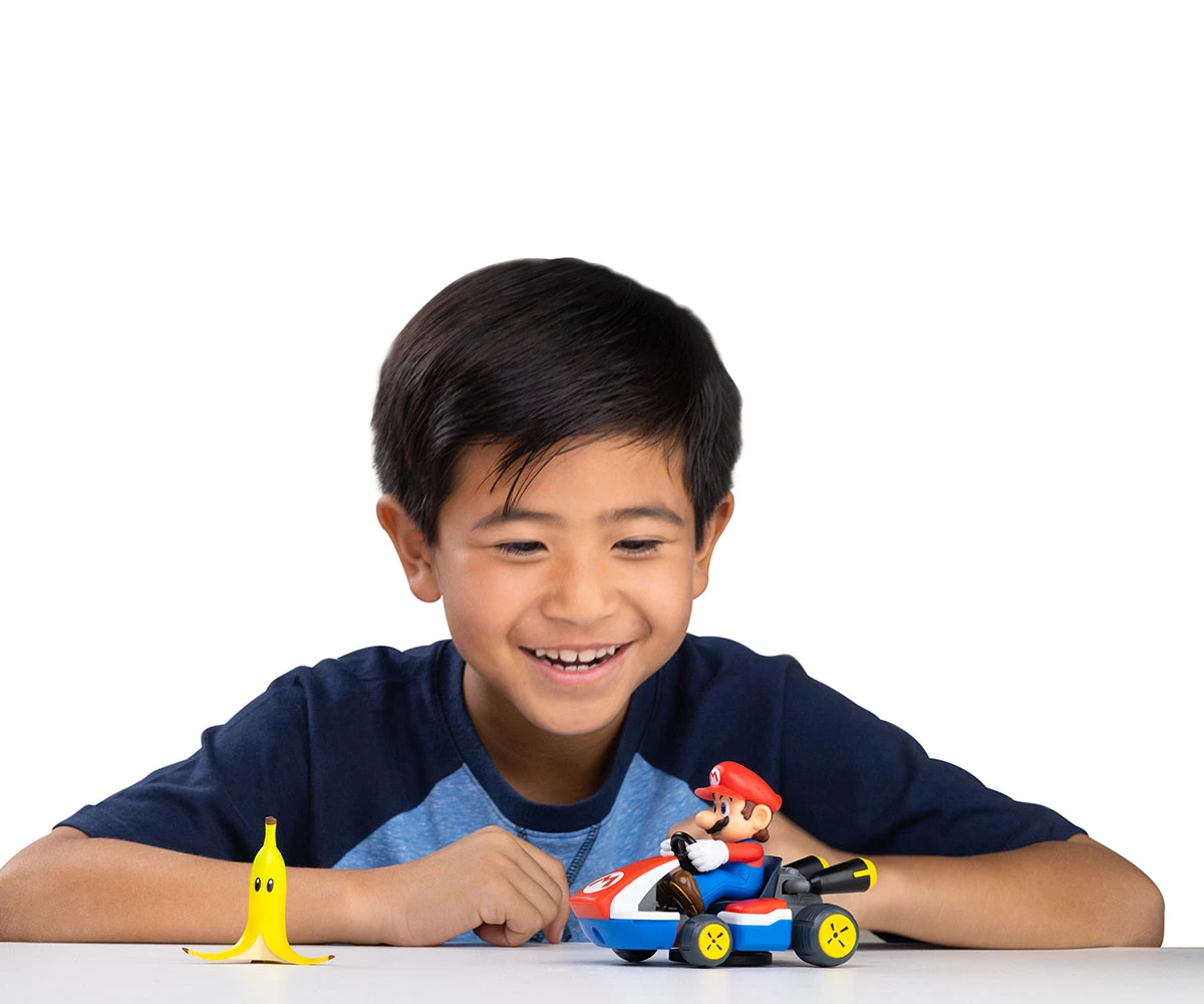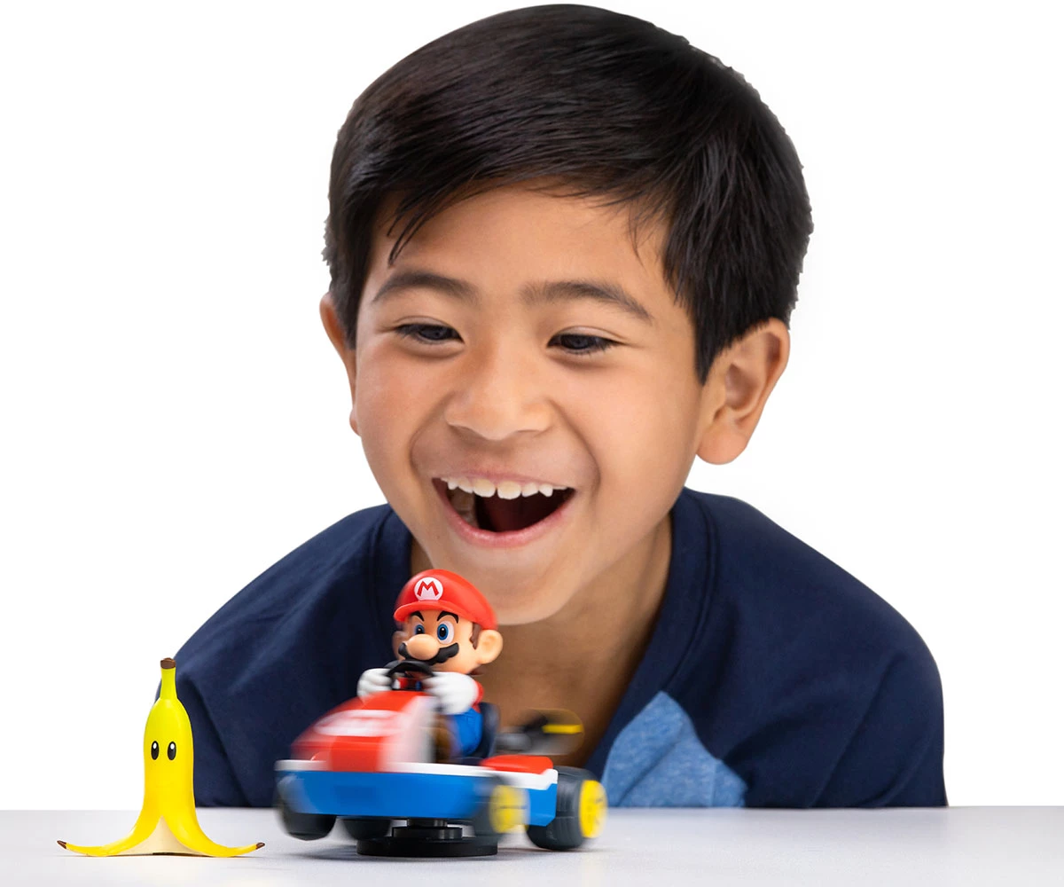 Завърти колата, натисни надолу и гледай как Марио се завърта на 360° при контакт с банановата кора – точно като в играта;