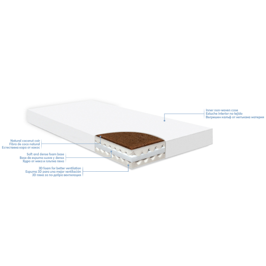 • Ядро от мека и плътна пяна с кора от кокос за опора на гръбначето и 2 слоя 3D пяна за по-добра вентилация и предотвратяване задържането на влага;
