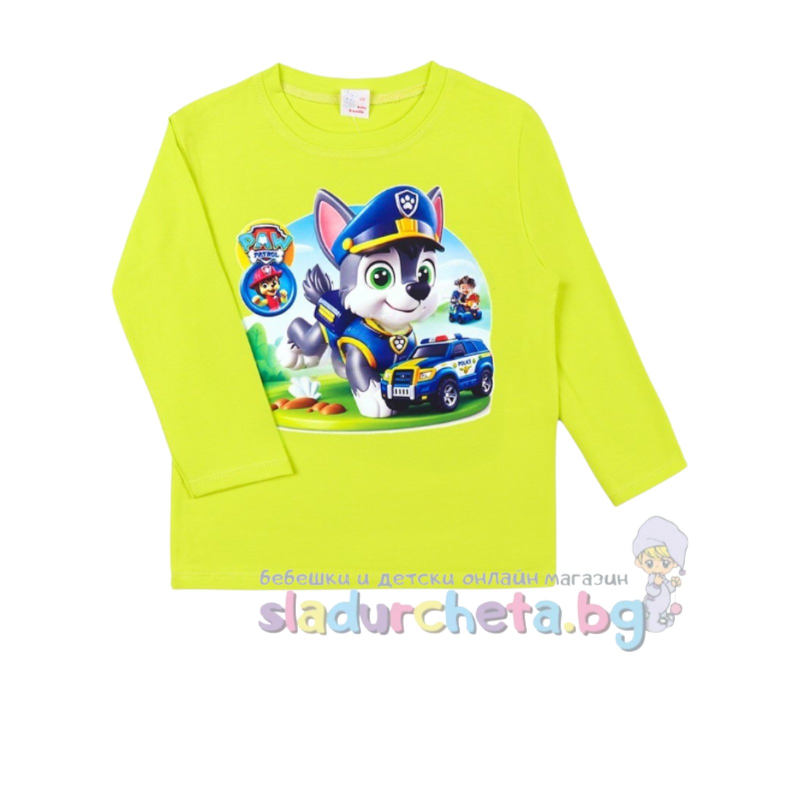 Блузата е с дълъг ръкав в зелен цвят с апликация на Пес Патрул;