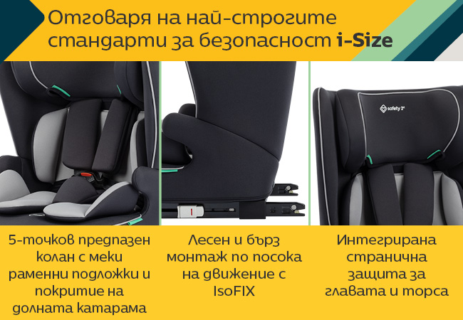 Столчето отговаря на най-новия и най-висок стандарт за безопасност R129 i-Size, което гарантира подобрена защита на главата и врата на детето при страничен и челен удар;