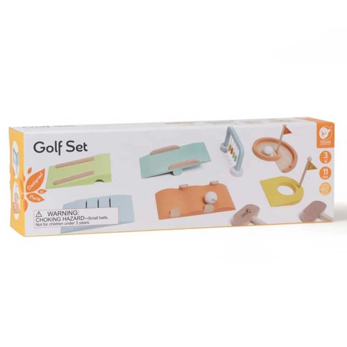 Детският дървен комплект за голф включва 2 стика за голф, топки и различни препятствия, които позволяват на децата да създават свои игрови сценарии и да се забавляват с приятели или семейството;