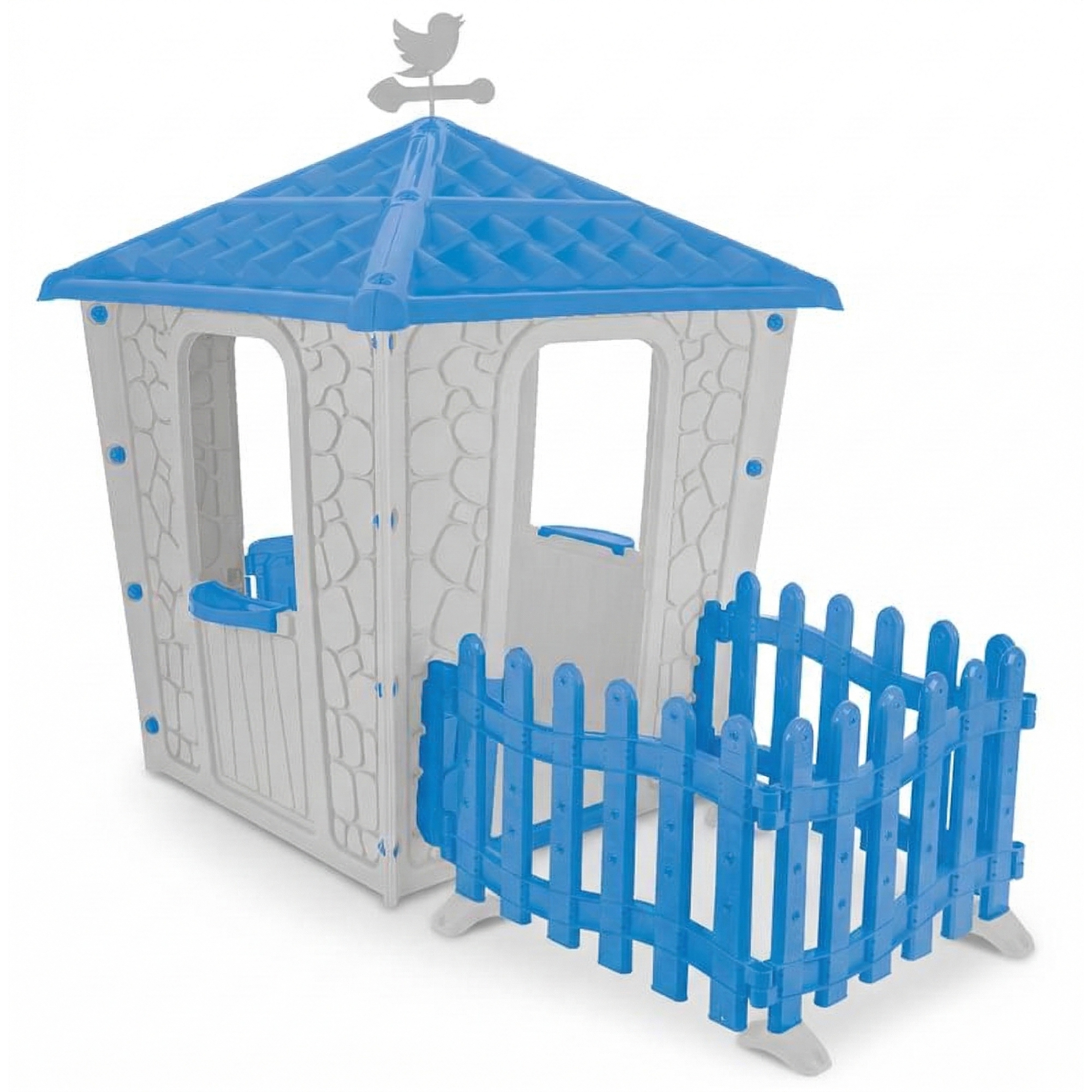 Тази детска къща с ограда е чудесно пространство за игри и забавления. Дизайнът е  със стени с каменен мотив и е включена ограда. Къщата е подходяща както за дома, така и за двора или градината.