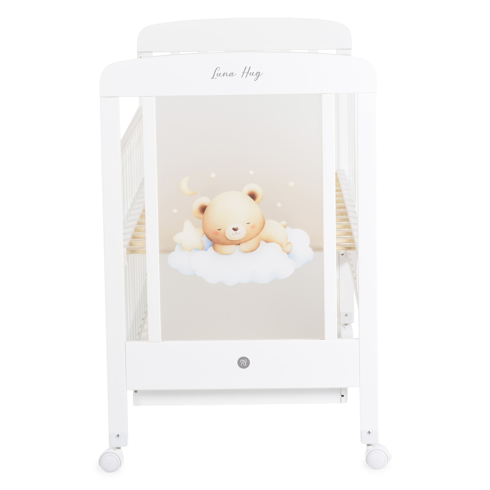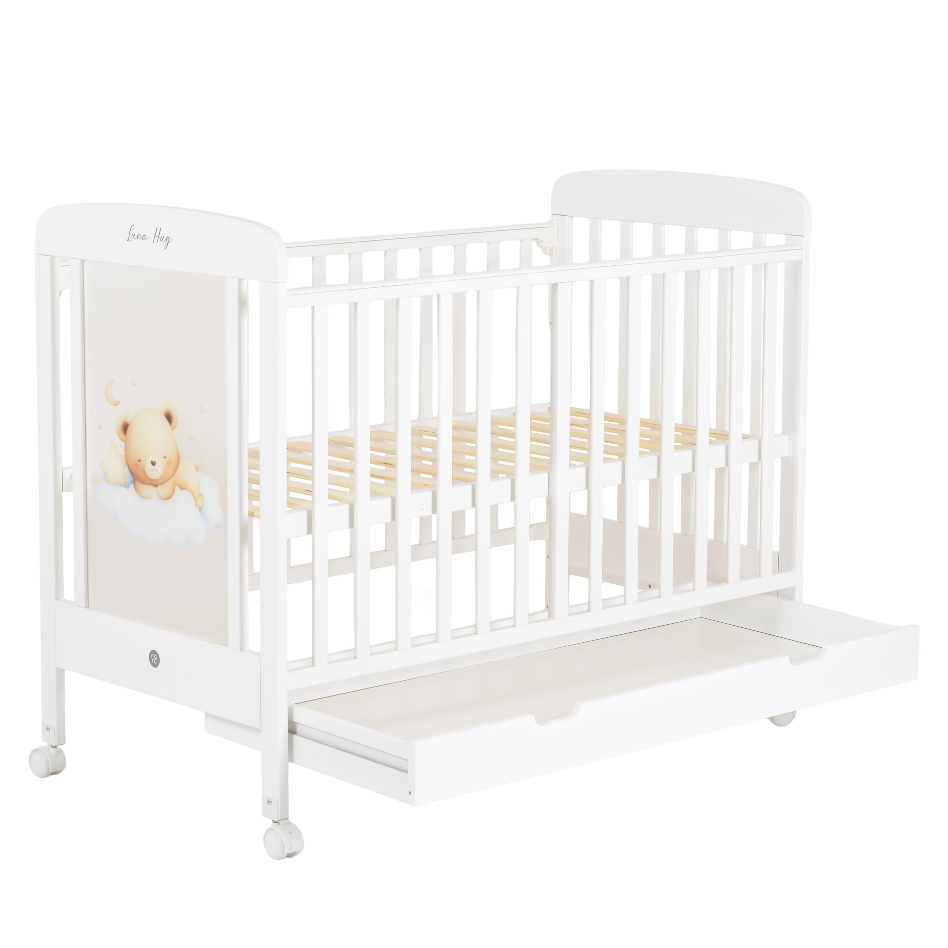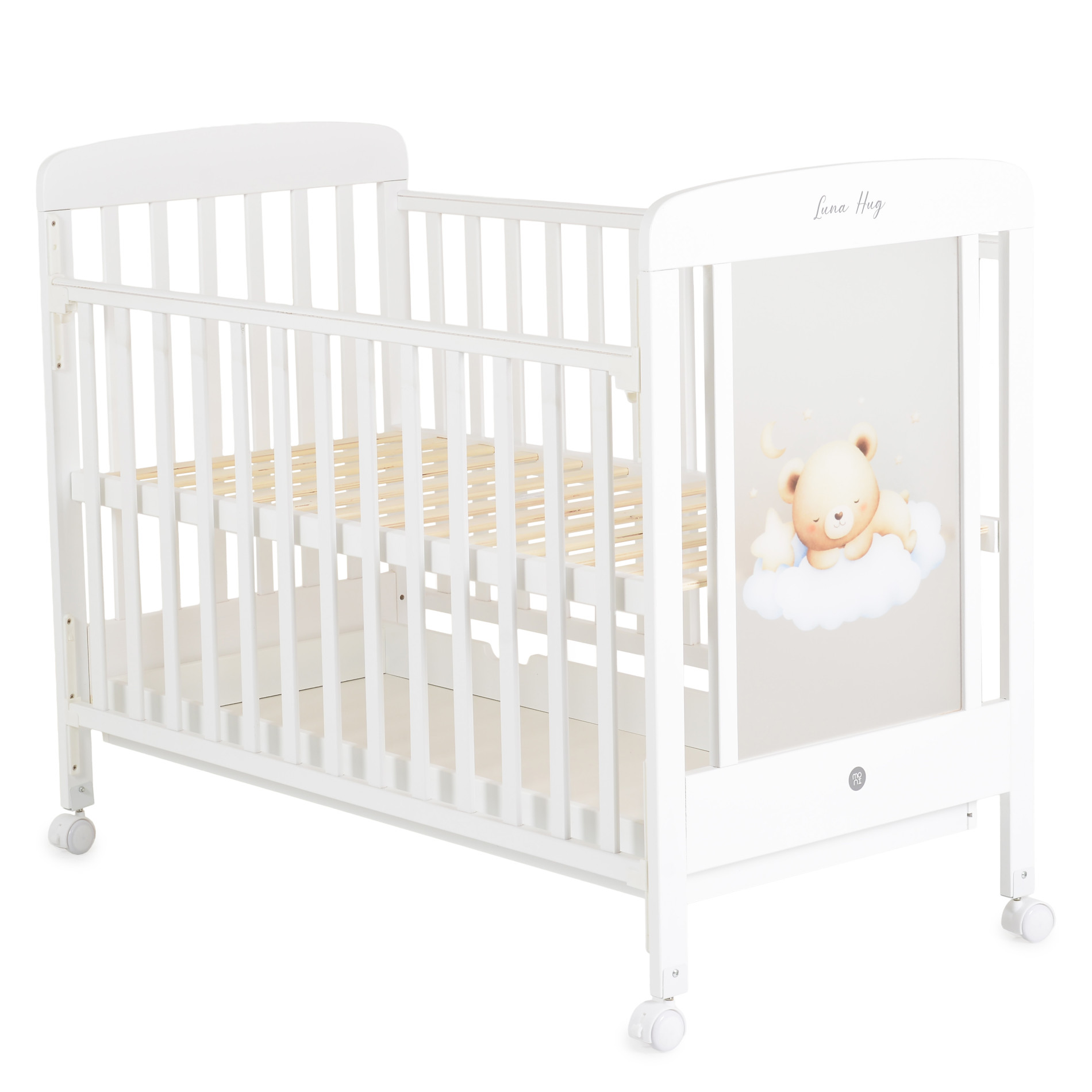 Моделът разполага с три нива за регулиране на височината на матрака, което позволява лесно адаптиране според възрастта и развитието на детето, а падащата странична преграда осигурява по-удобен достъп до бебето и улеснява ежедневните грижи на родителите;