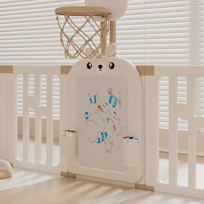 • Баскетболен кош и дъска за рисуване с маркери, които насърчават активната и творческа игра;