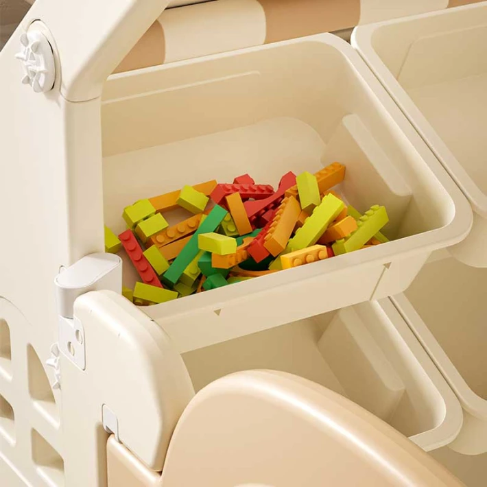• Тристепенна етажерка с шест контейнера за съхранение на играчки, книжки и аксесоари;