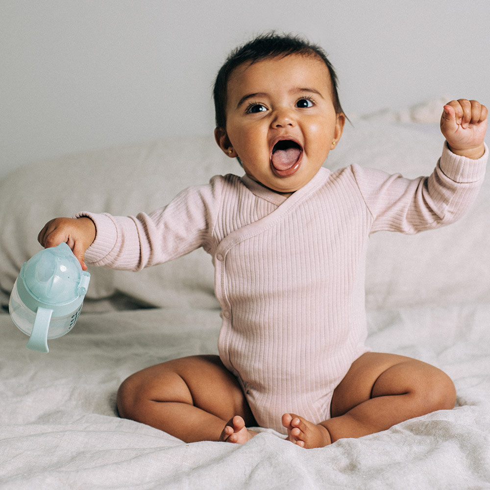 Идеалната първа чаша: ергономичната форма и големите дръжки я правят изключително удобна за преход от шише към чаша;