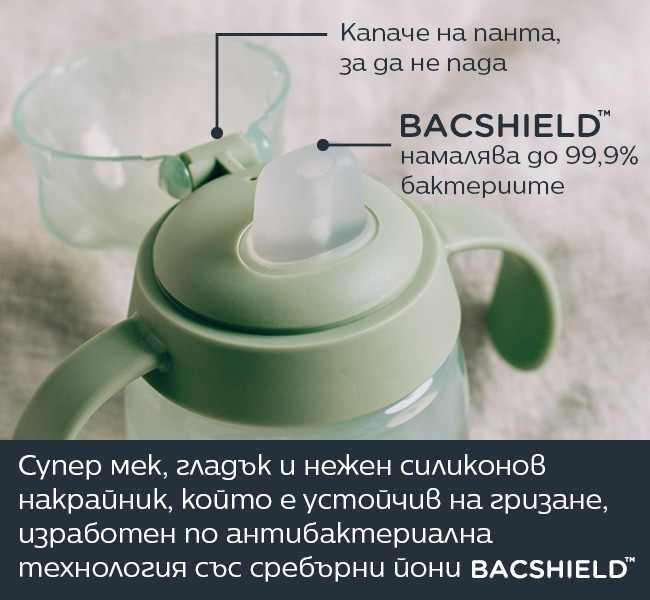 Хигиената на първо място: накрайникът за пиене е направен с антибактериална технология със сребърни йони BACSHIELD™, която намалява бактериите с до 99,9%, като предотвратява развитието на нежелани микроби;