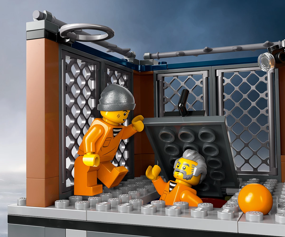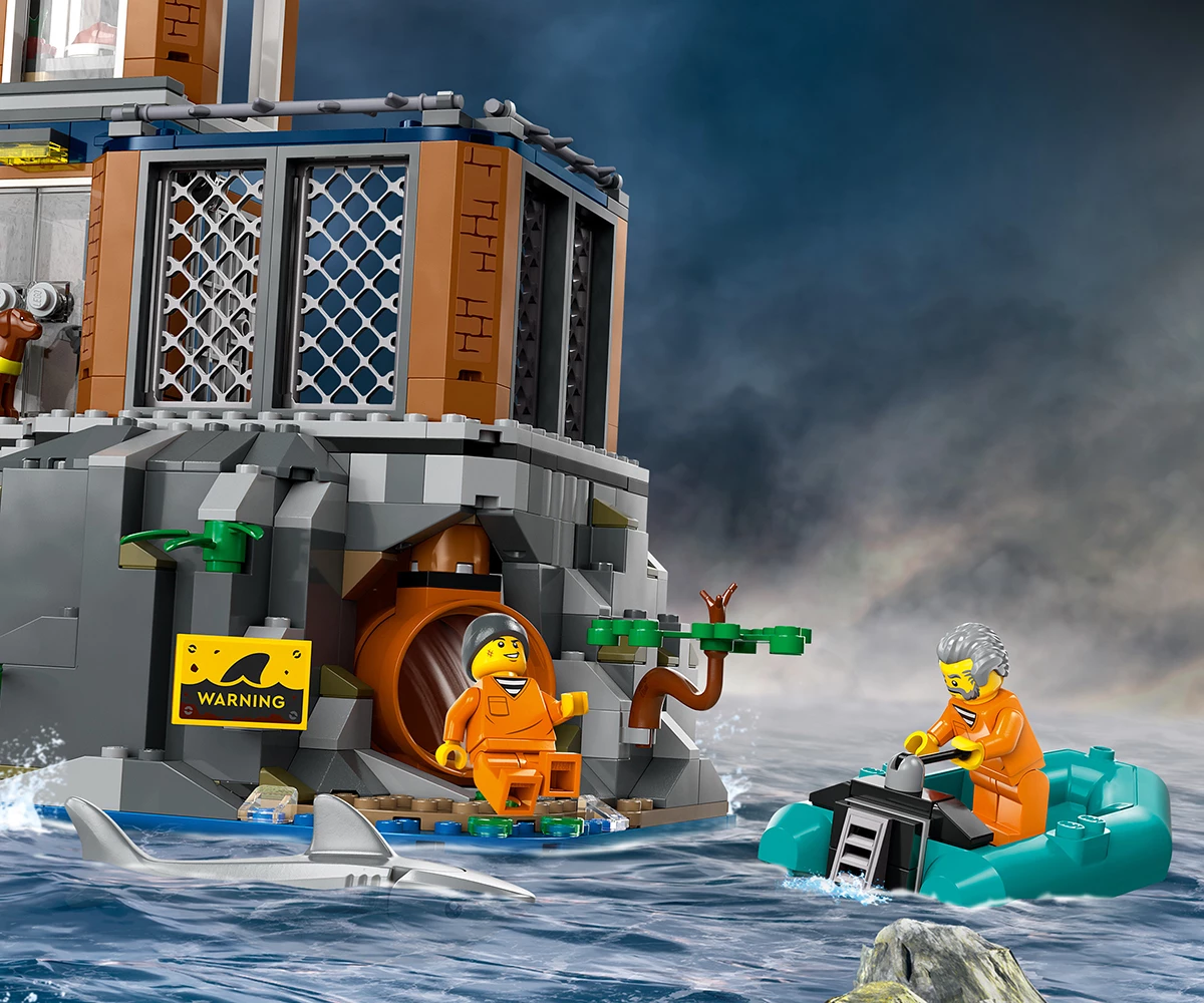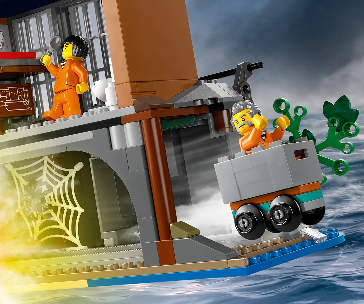 Затворнически остров от LEGO® с множество забавни функции – включва килия с тунел за бягство, който води до изоставена мина, плюс двор с таен капак за бягство, който води до неизползвана канализационна тръба;