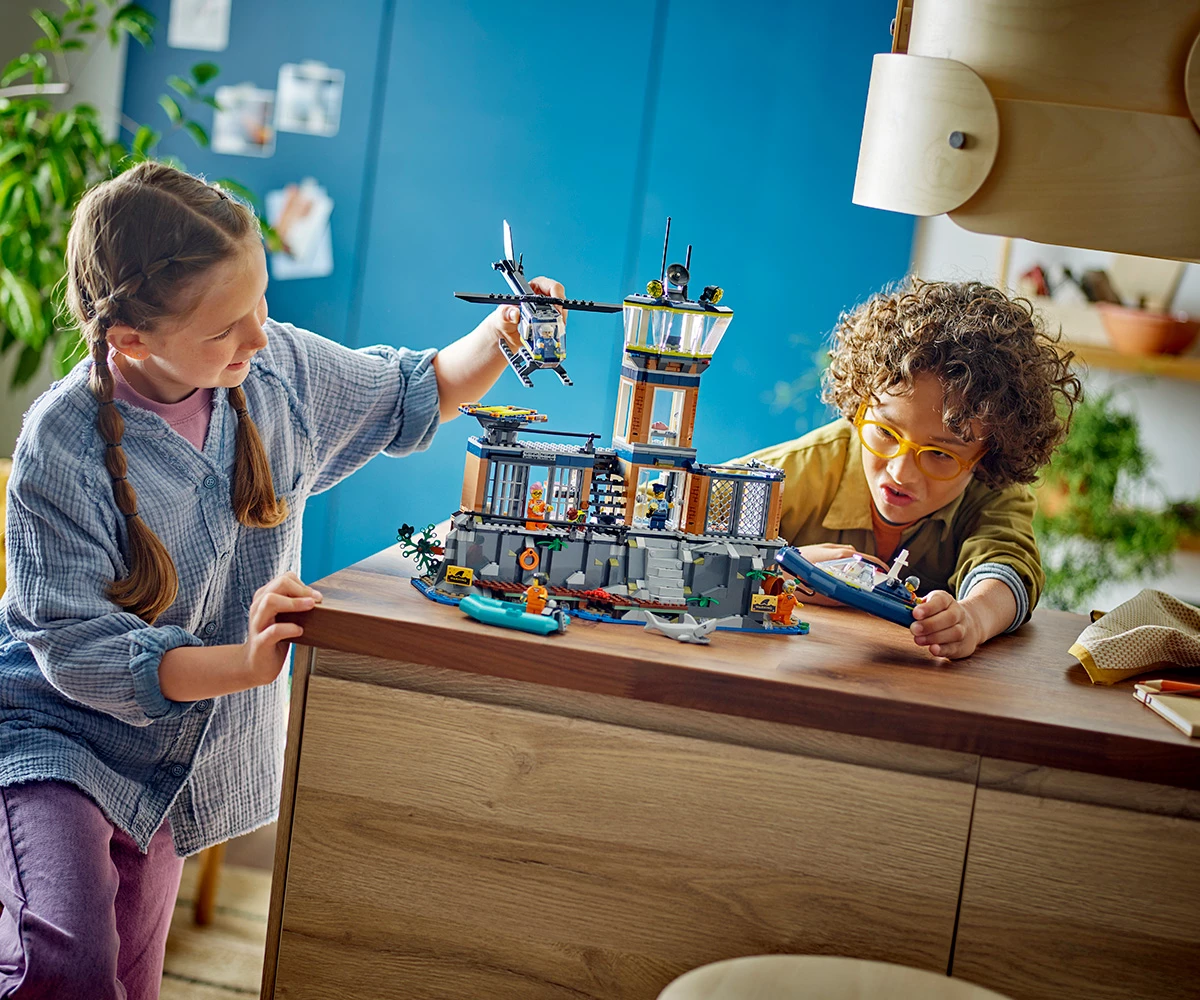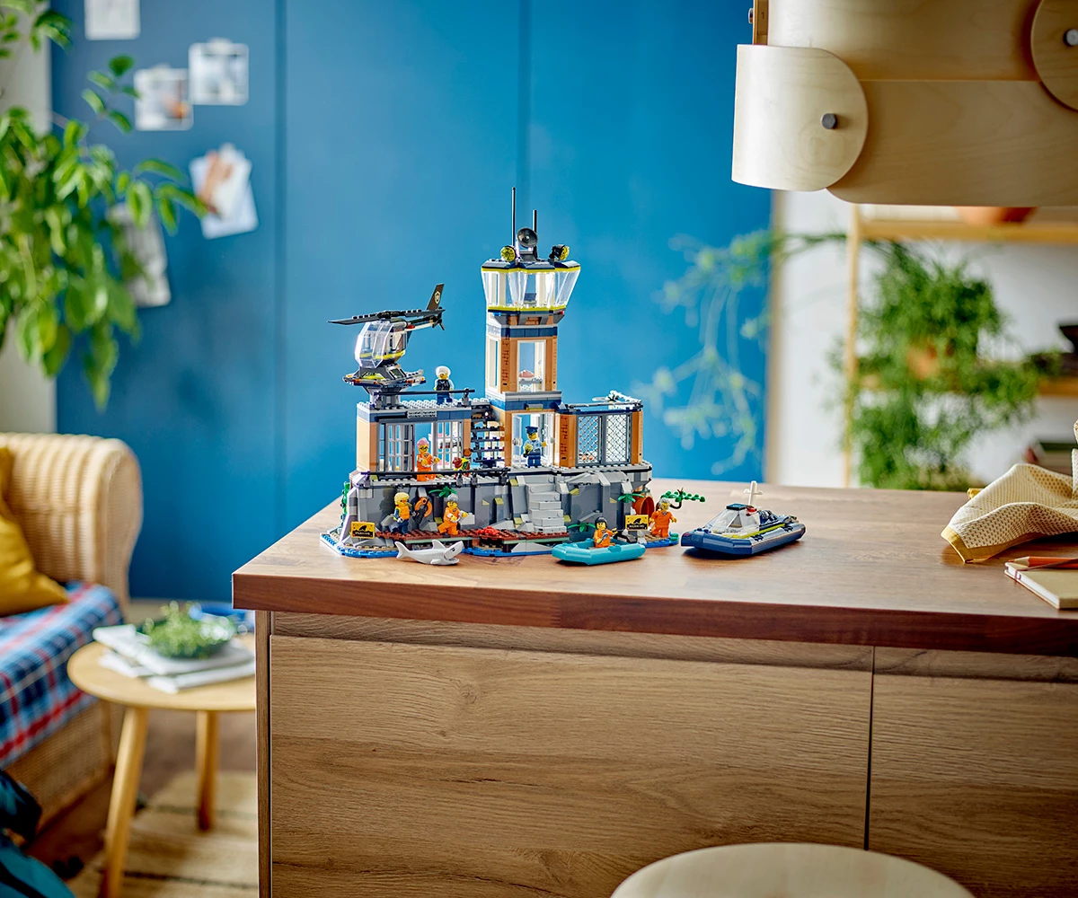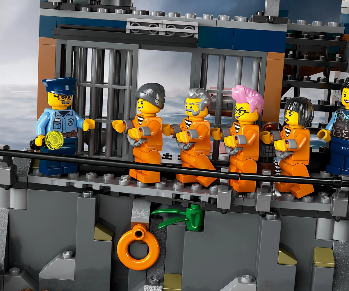 Затворнически остров от LEGO® с множество забавни функции – включва килия с тунел за бягство, който води до изоставена мина, плюс двор с таен капак за бягство, който води до неизползвана канализационна тръба;