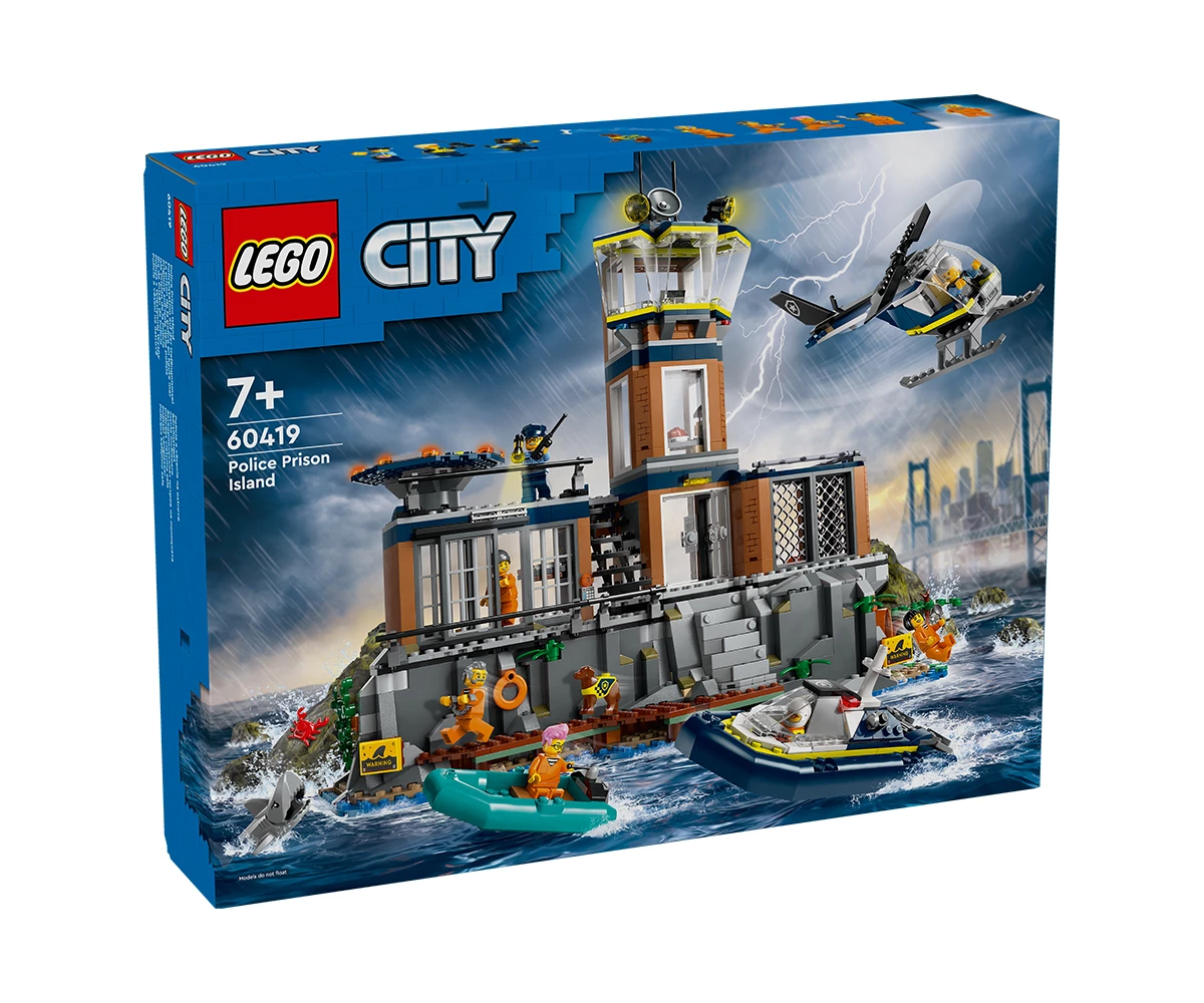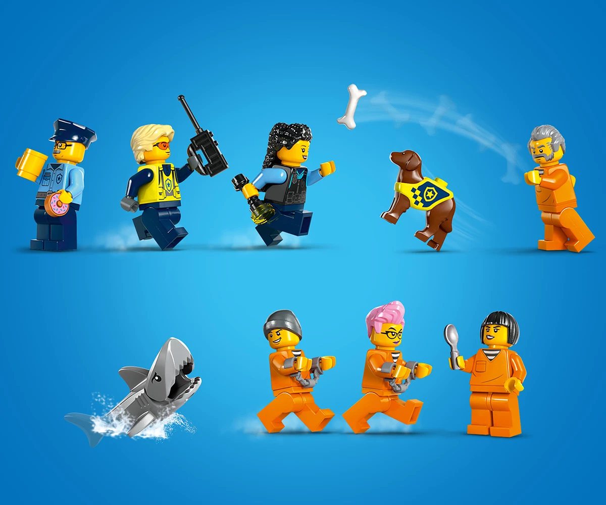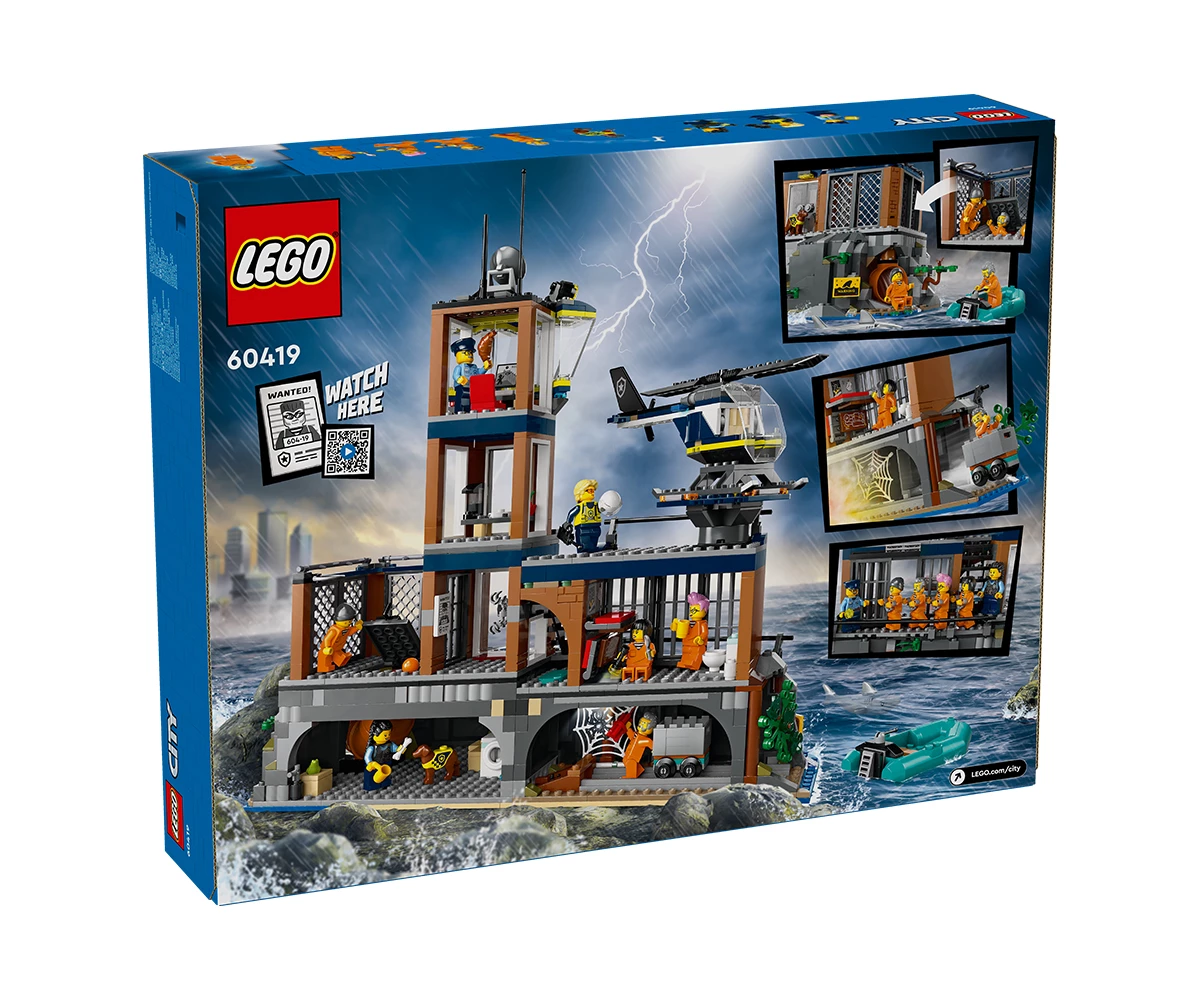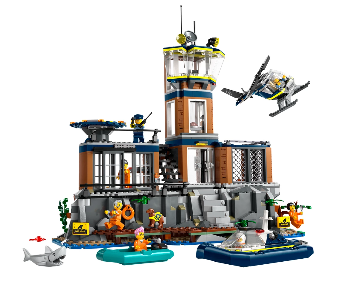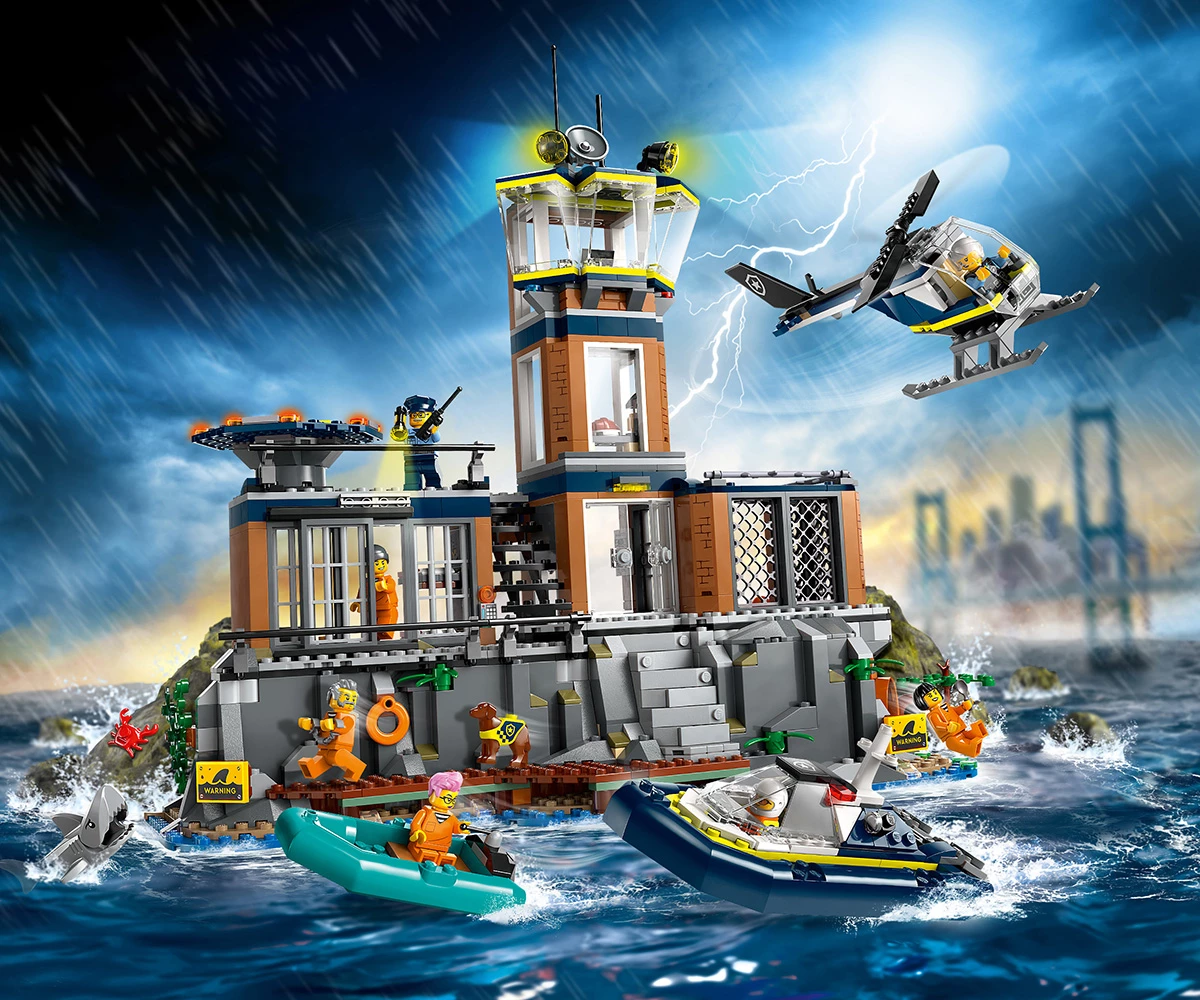 Затворнически остров за конструиране със стръмна скала, затвор, полицейска лодка, гумена лодка, хеликоптер, минифигури на 3-ма полицаи и 4-ма затворници, плюс фигури на полицейско куче и акула;