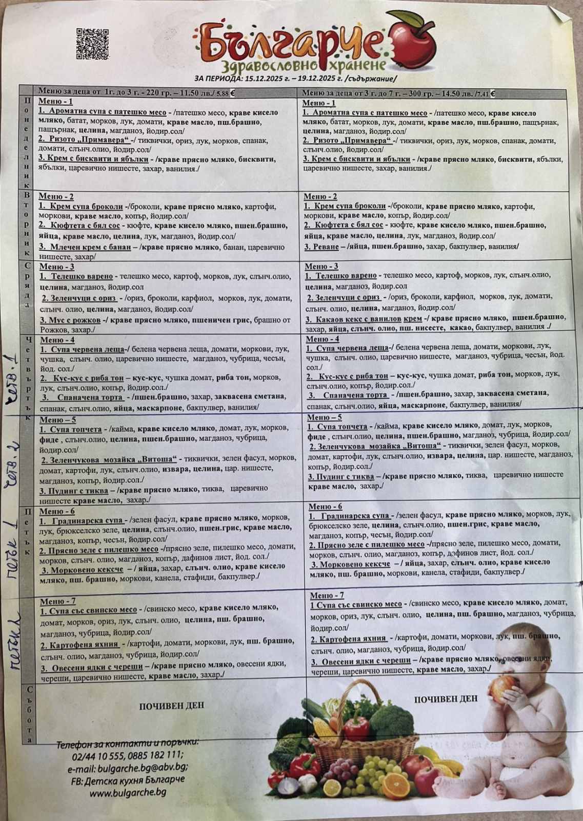 Съботните доставки са временно отменени от 01.06.2025г., детска кухня БЪЛГАРЧЕ ще предлага двойни менюта в четвъртък и в петък и за да няма объркване - моля отбелязвайте в поръчките дните от седмицата, които са в таблицата на менюто! В четвъртък се доставят менютата за четвъртък и петък, а в петък се доставят менютата за събота и неделя!