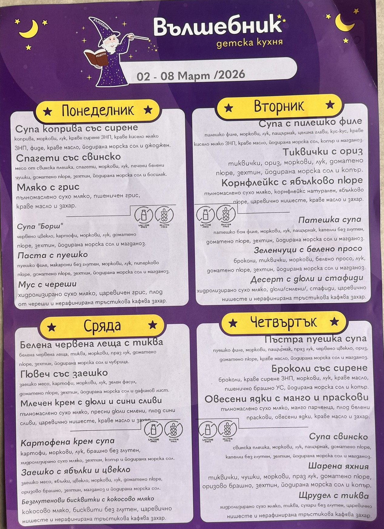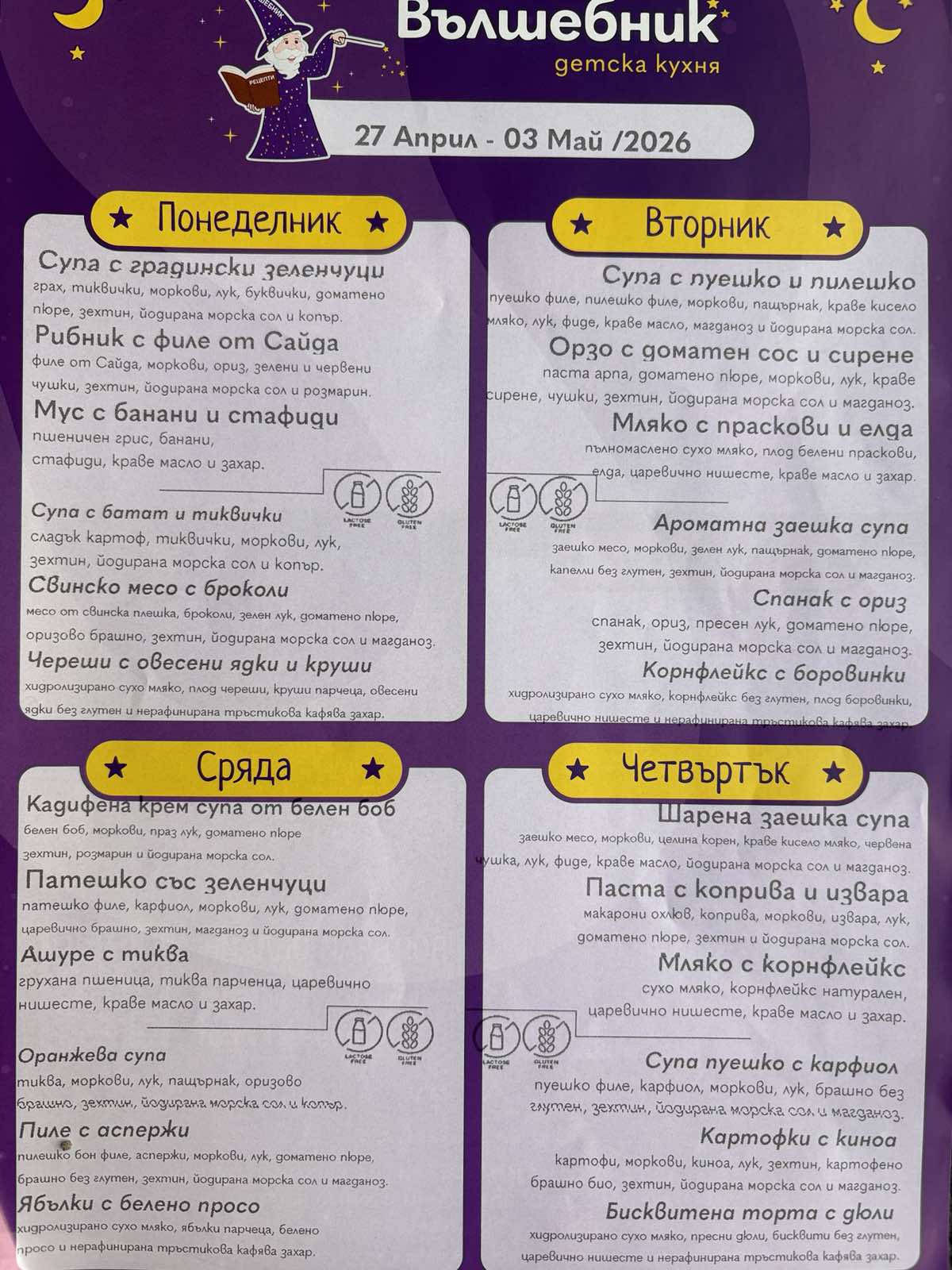 Менютата са съобразени изцяло с хранителния режим на децата Ви и техните калорийни нужди.