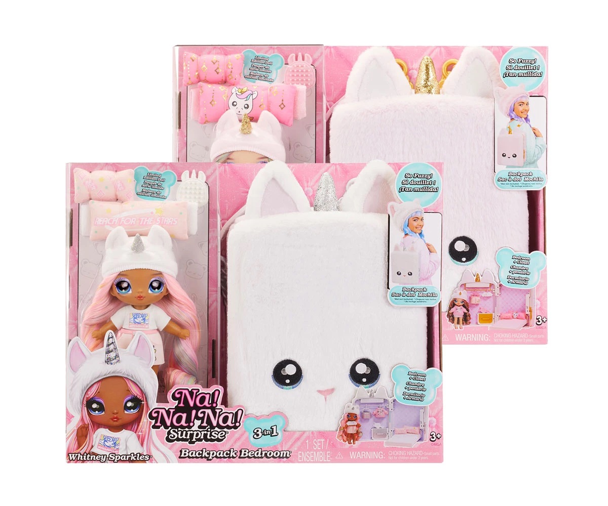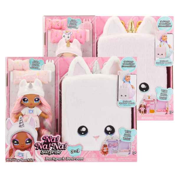 Бебешки и детски магазин "СЛАДУРЧЕТА" и марката "MGA" представят на Вашето внимание Na! Na !Na! Surprise - Комплект 3в1 кукла с раница-спалня със следните характеристики: