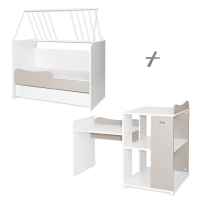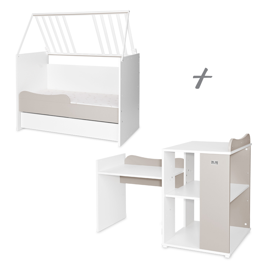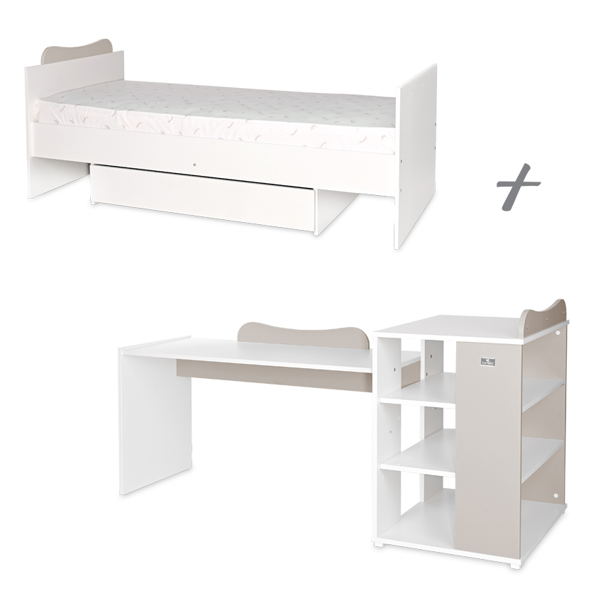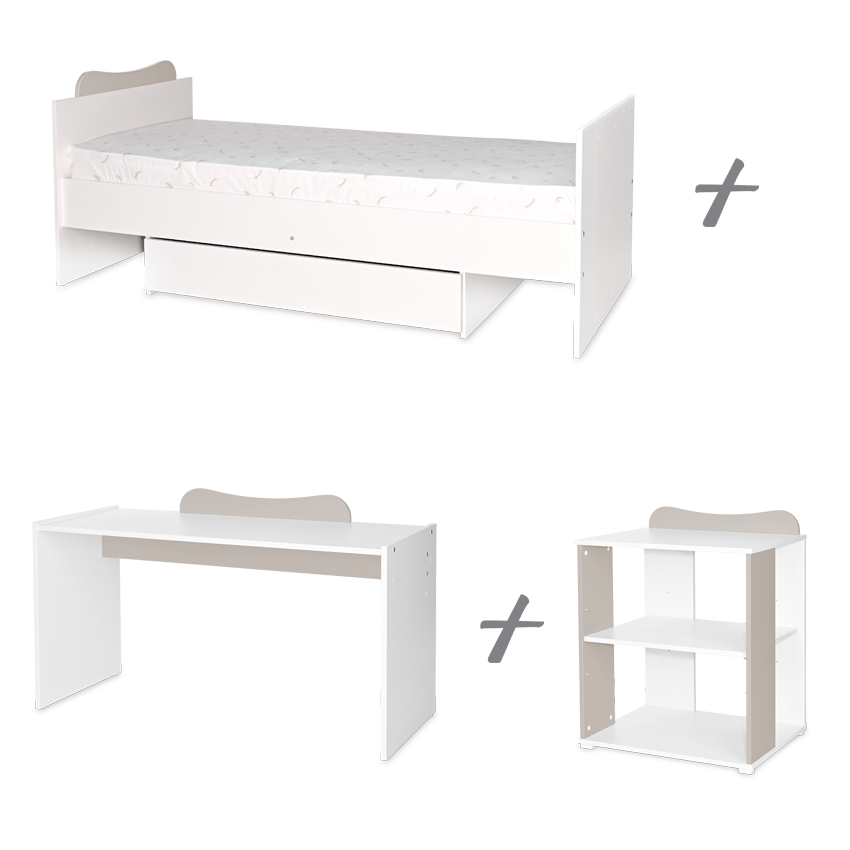 5 варианта за мотаж: - Вариант А - детско легло с габаритни размери Ш/Д/В - 124/71/99 см (предназначено е за матрак 60/120 см) и шкаф с габаритни размери Ш/Д/В - 71/55/90 см; - Вариант B - детско легло с габаритни размери Ш/Д/В - 124/71/99 см (предназначено е за матрак 60/120 см) и малко бюро (размери на плота Ш/Д/В 65х51хh 55/65 см) съединено с шкафа. Размери на модула Ш/Д/В 122х71х90 см; - Вариант C - детско легло тип къщичка с габаритни размери Ш/Д/В 124х71х142 см (предназначено за матрак 60х120 см) и малко бюро (размери на плота Ш/Д/В 65х51хh 55/65 см) съединено с шкафа. Размери на модула Ш/Д/В 122х71х90 см; - Вариант D - юношеско легло с габаритни размери Ш/Д/В 195х91х80 см (Матраците и подматрачната рамка не са включени в комплекта) и голямо бюро; - Вариант Е - юношеско легло с габаритни размери Ш/Д/В 195х91х80 см (Матраците и подматрачната рамка не са включени в комплекта), шкаф и бюро;