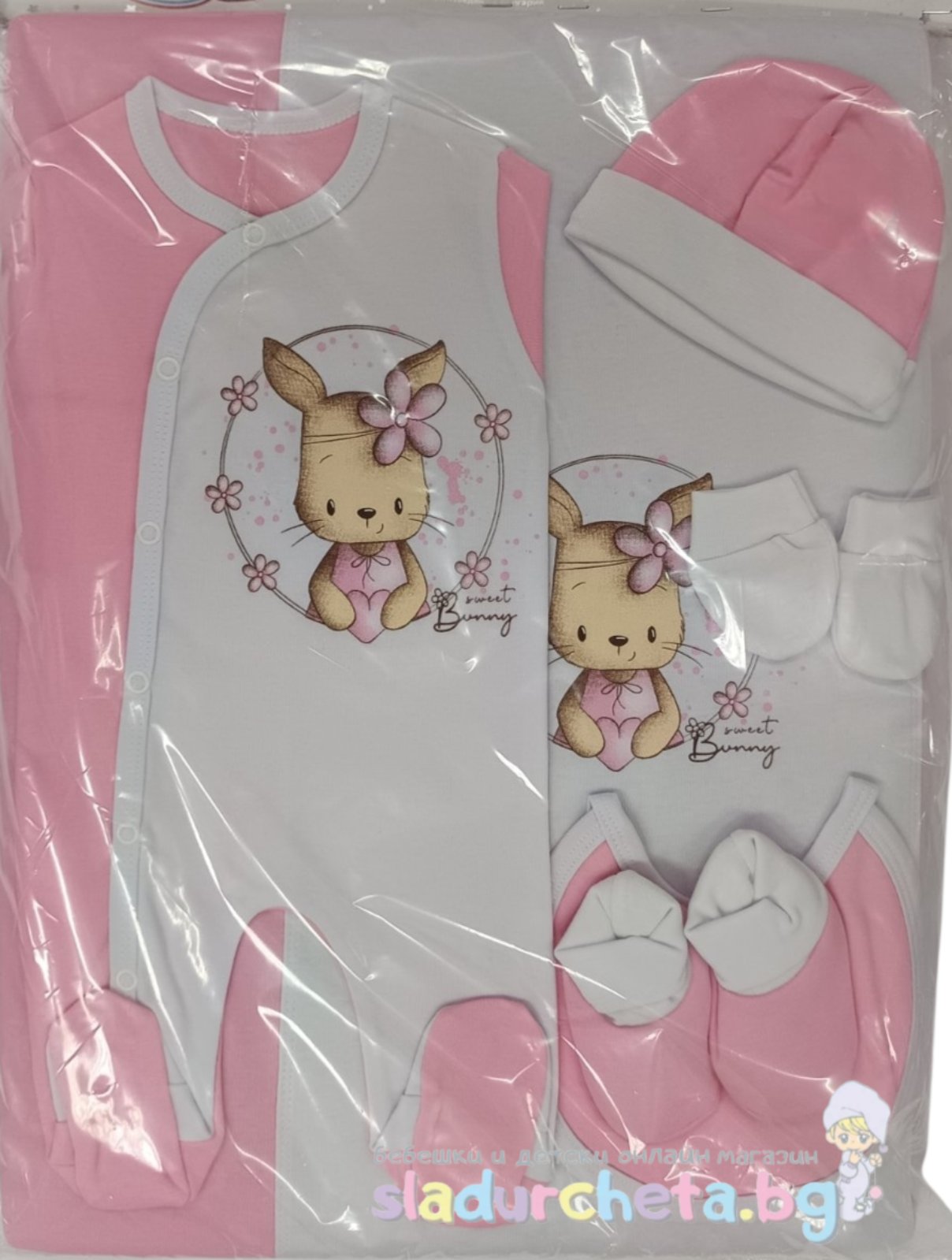 Нежна материя и цветен розово-бял дизайн с апликация на зайче с цвете;