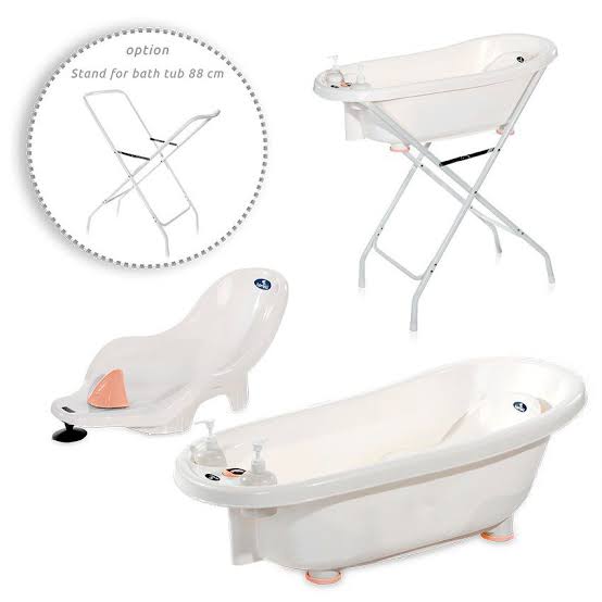 Комплектът включва: вана с отвор за оттичане и термометър, подложка за къпане;