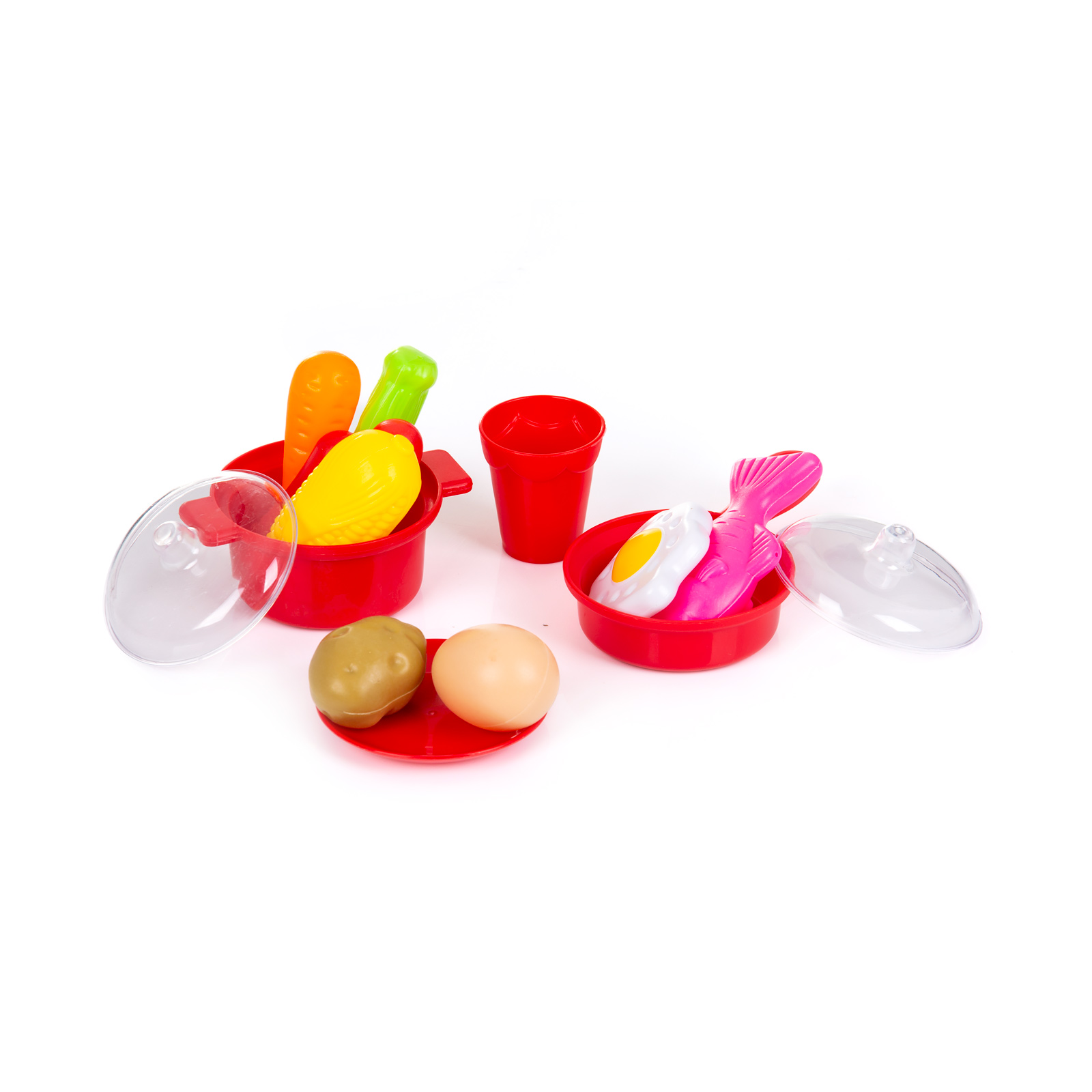 Разнообразие от 53 цветни и реалистични аксесоари - във формата на различни видове хранителни продукти (зеленчуци, плодове, кутии сок, снакс, риба, месо и други) , както и богат набор от кухненски съдове и прибори (тенджера, тиган, чинийка, чашка, пособия за готвене);