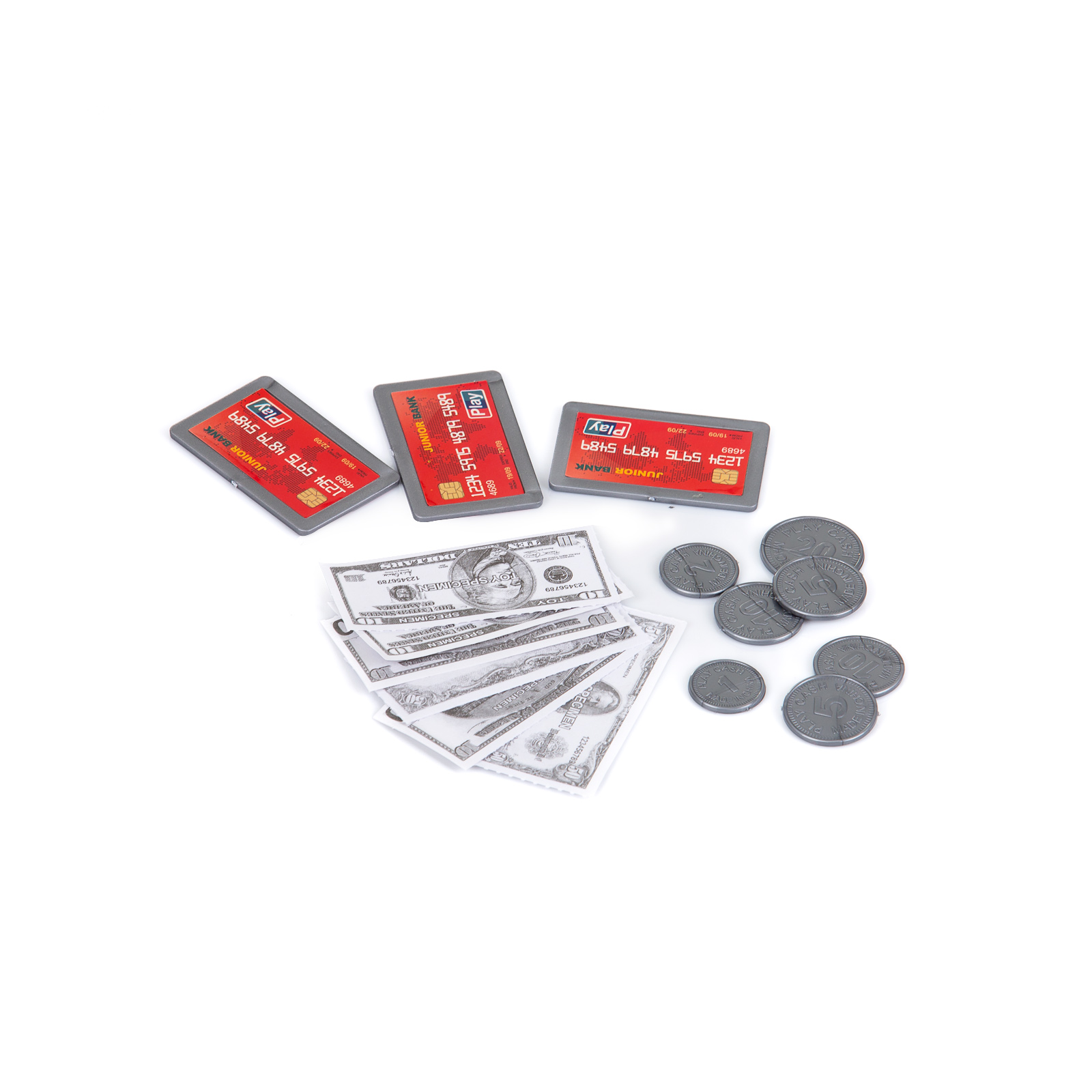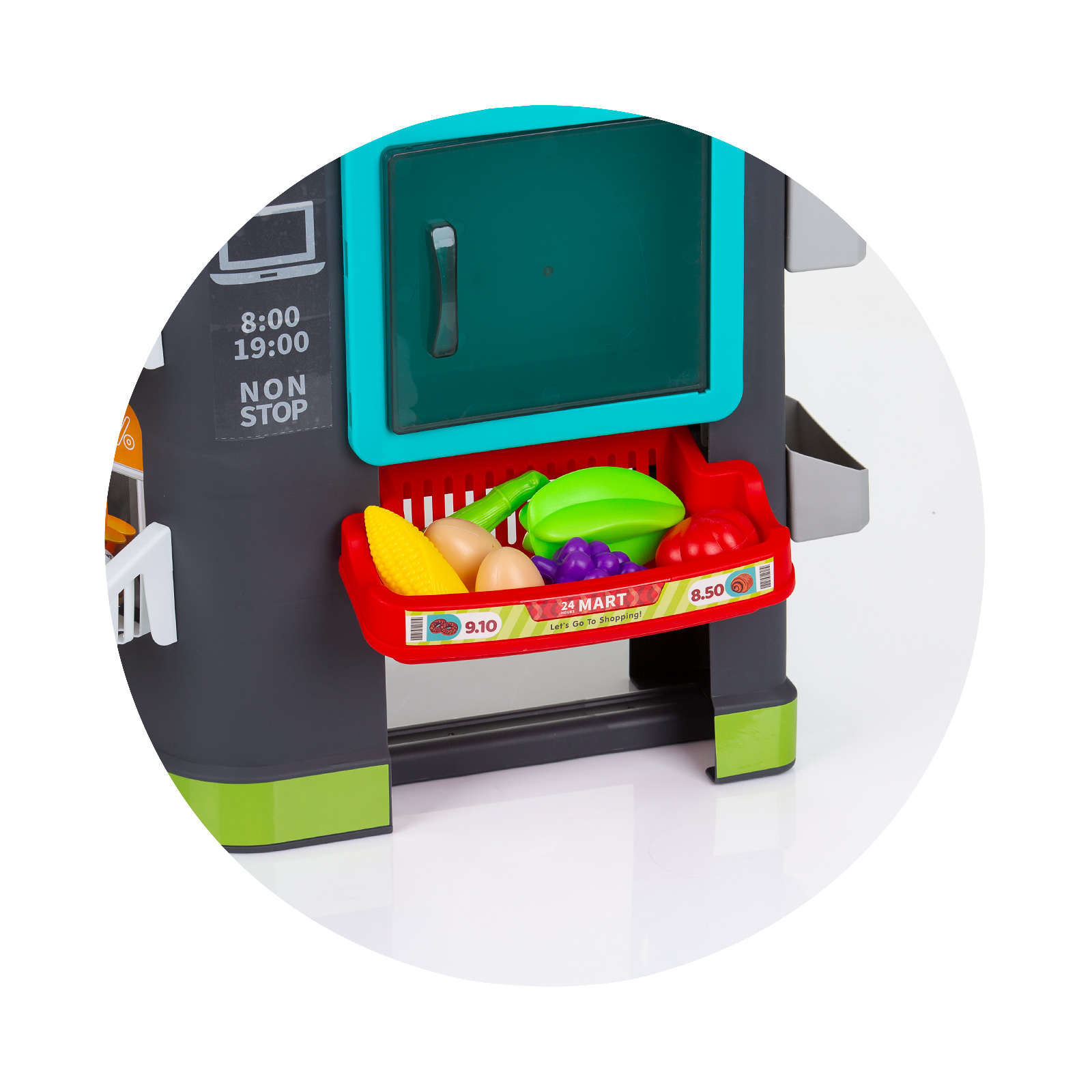 Разнообразие от аксесоари - 81 броя различни хранителни продукти за пазаруване (зеленчуци, плодове, напитки, снакс и други), както и банкноти, монети и кредитни карти;