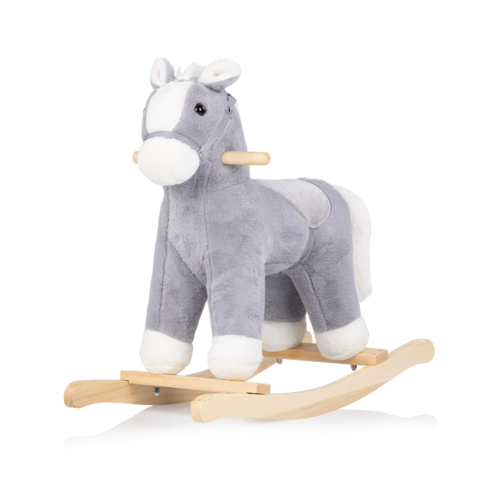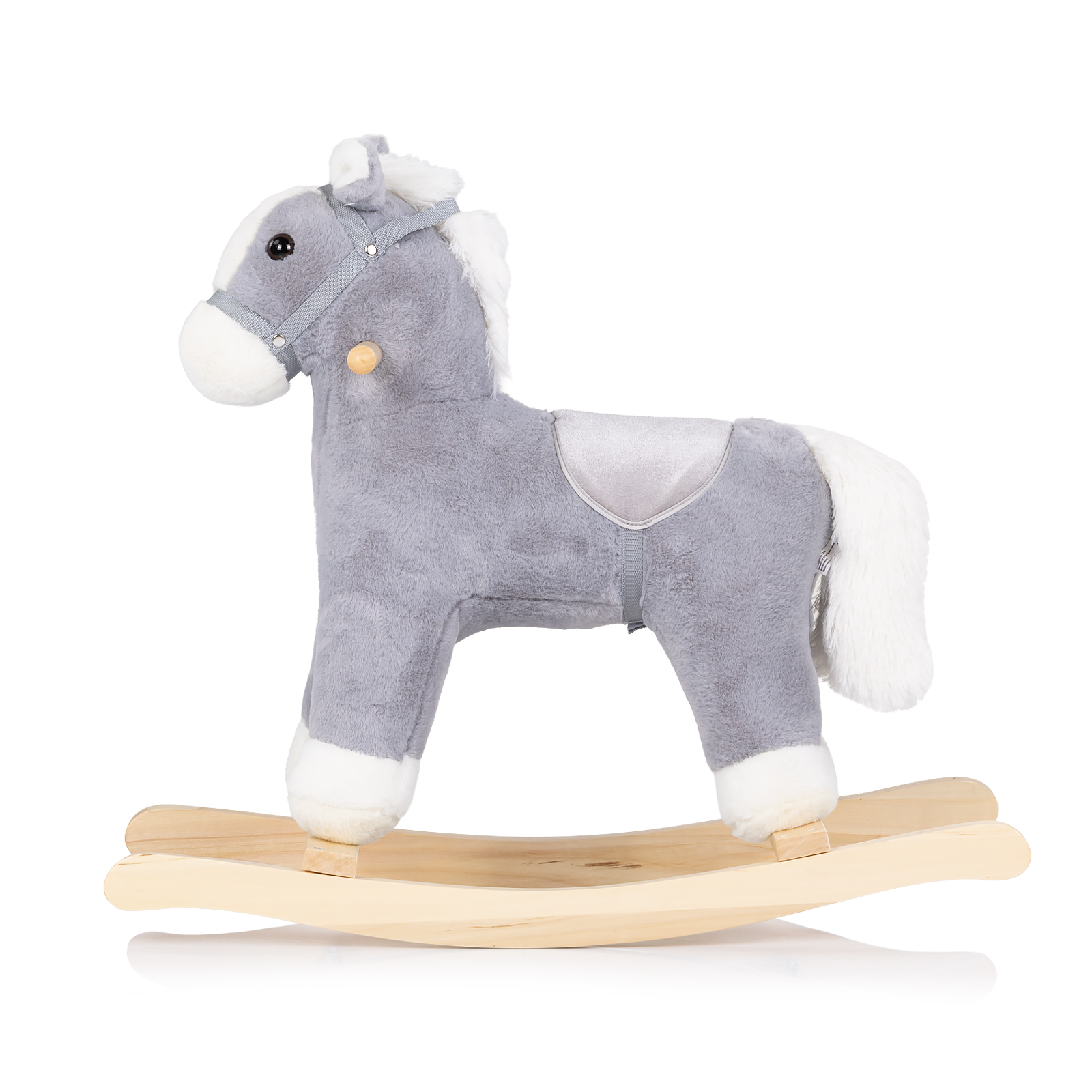 • Материал: дърво за люлеещата основа и дръжките и мек плюш за тялото на играчката;