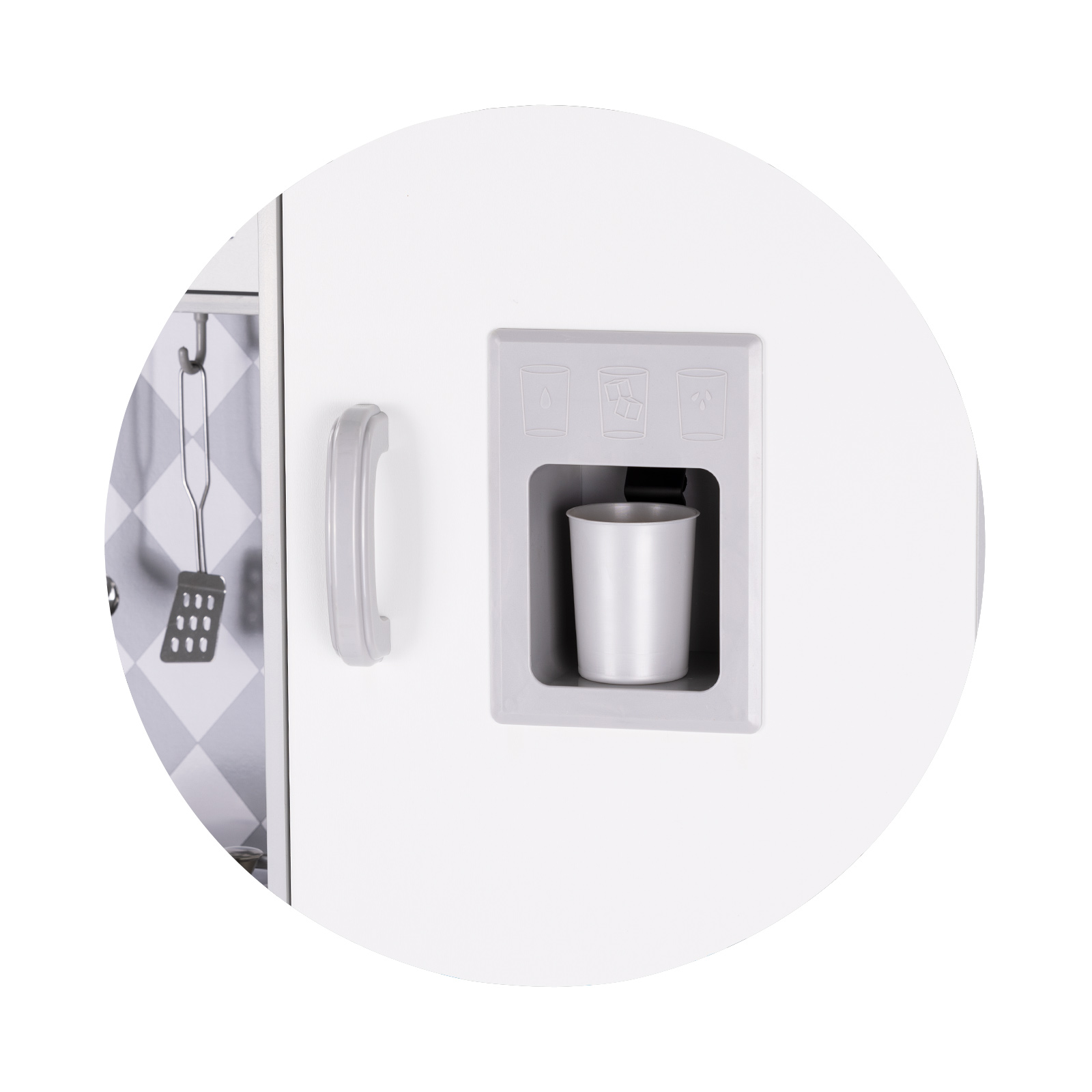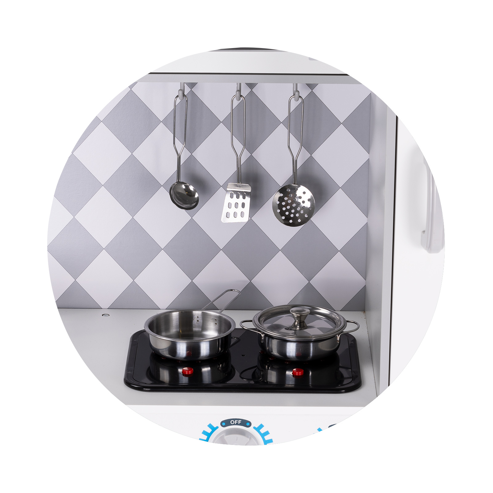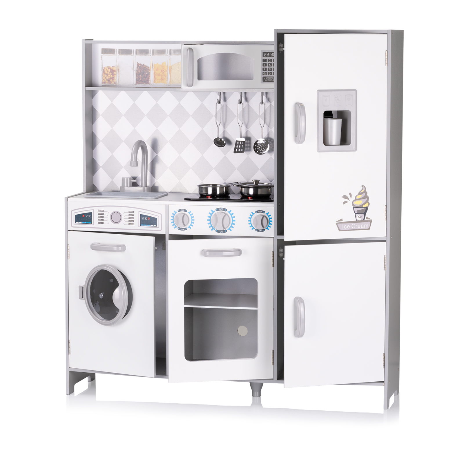 Оборудвано с реалистични уреди: мивка, машина за лед, съдомиялна машина, плоча за готвене със звук и светлина, комплект от 5 кухненски прибори и тенджери;