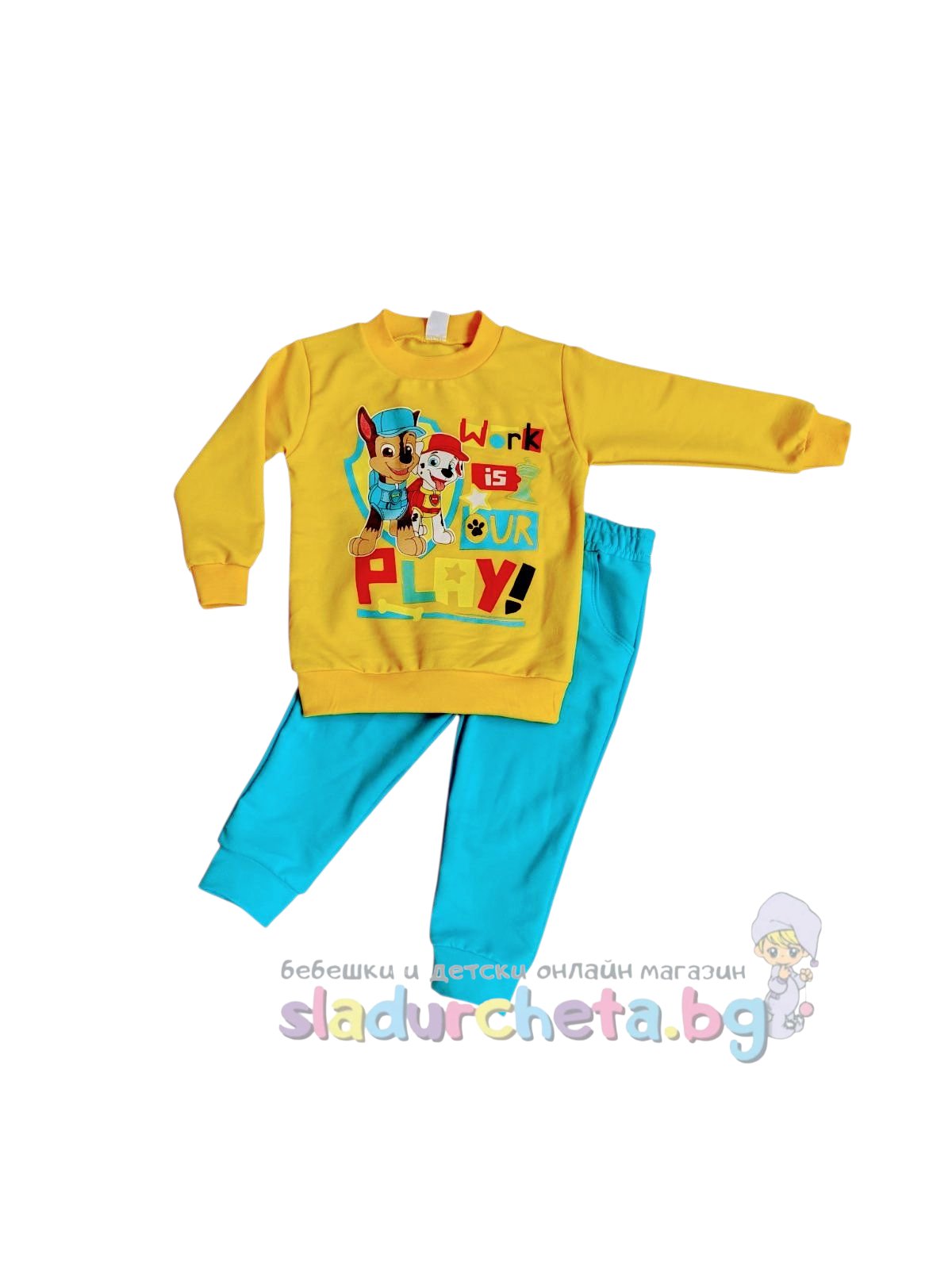 Блузата е с дълъг ръкав в жълт цвят с цветна апликация на Пес Патрул;