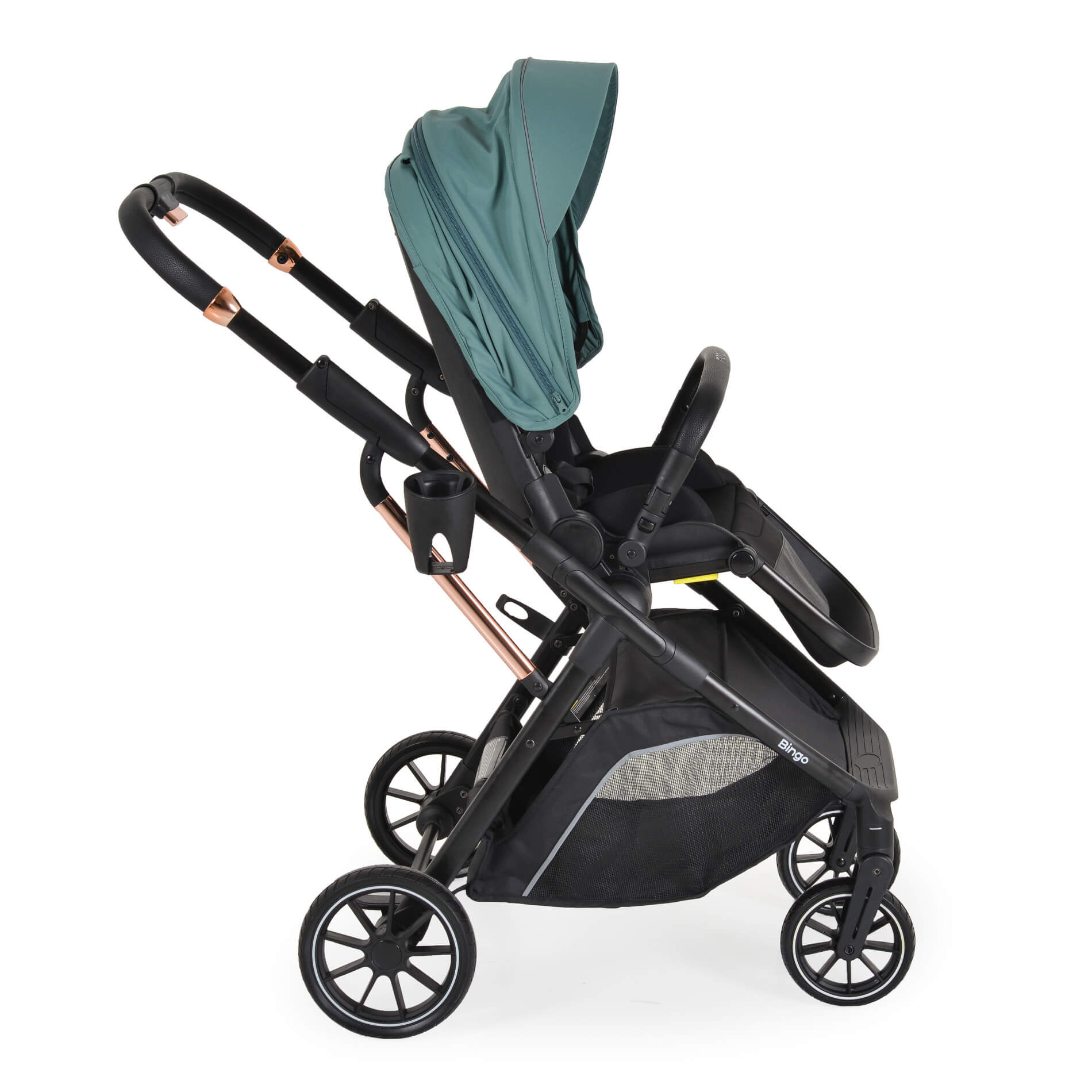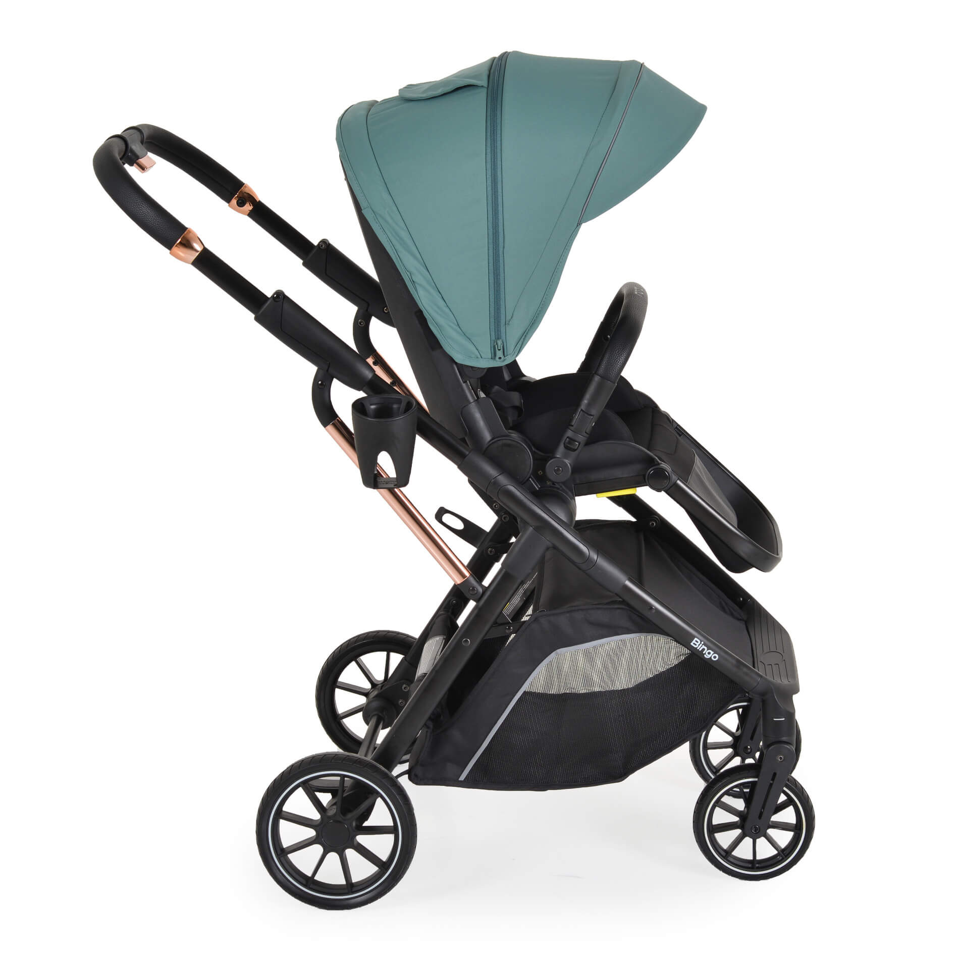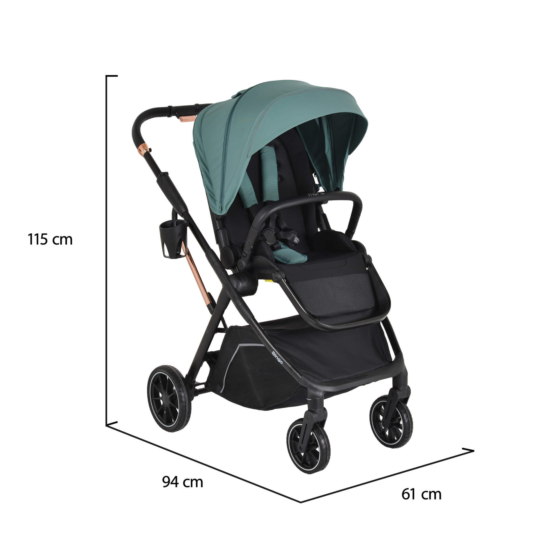 Предни колела с въртене на 360°, задни колела със свързана спирачка и амортисьори, осигуряващи допълнителен комфорт и стабилност при возене;