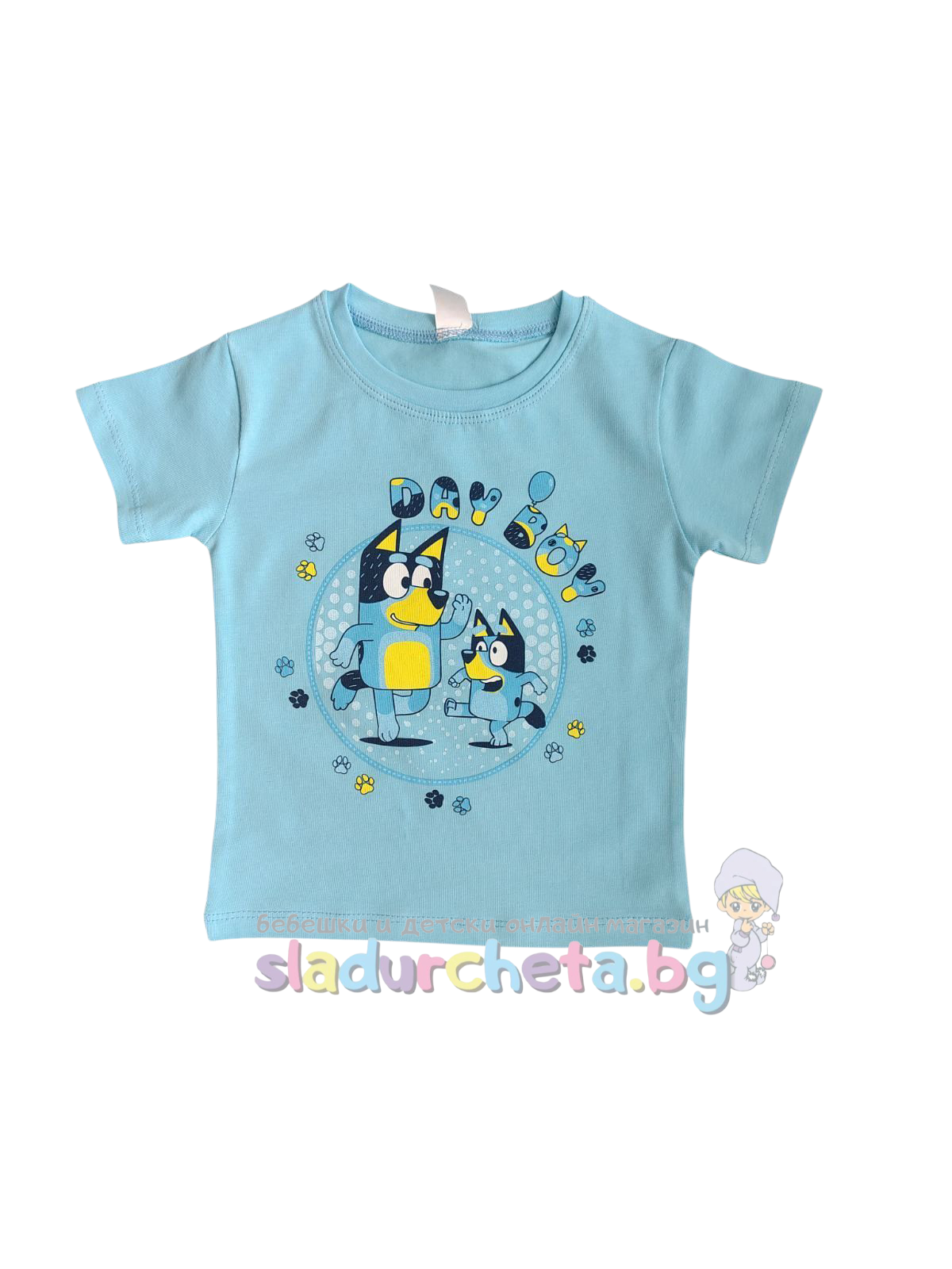 Тениската е с къси ръкави в син цвят с апликация на Блуи;