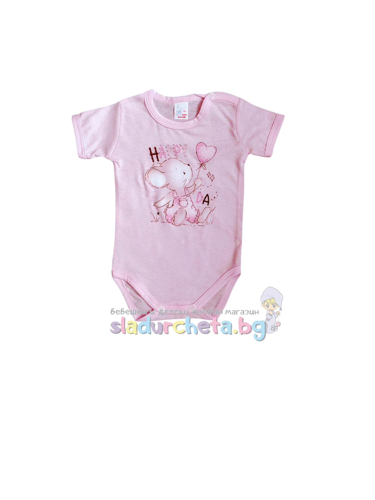 Бодито е с къс ръкав в розов цвят с апликация на мишле;